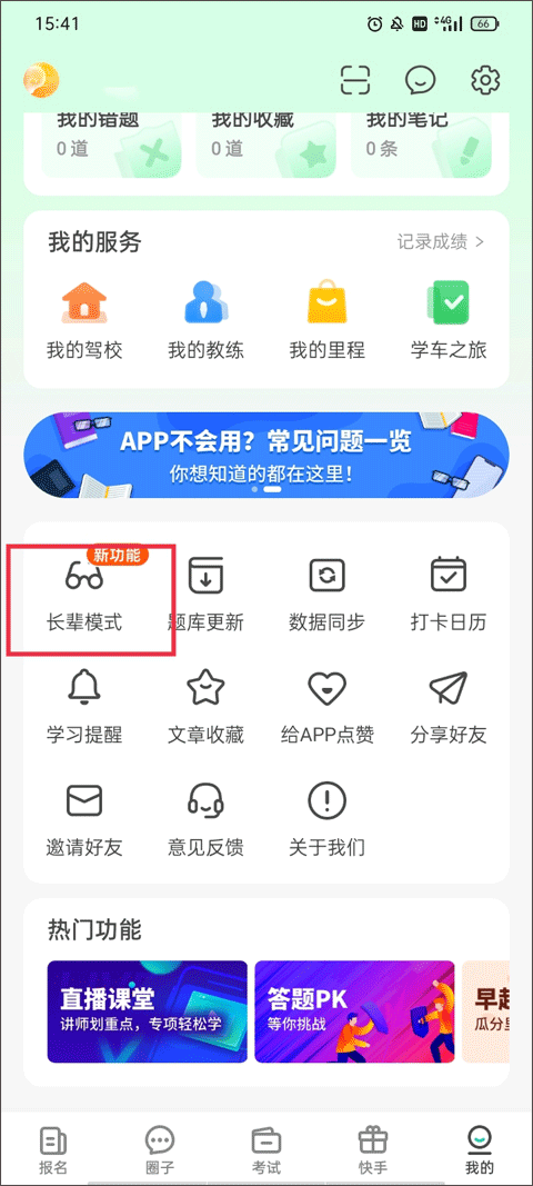 1、先切换到【我的】这个界面,里面有我的服务、热门功能这些板块,在里面找到“长辈模式”并且点进去。