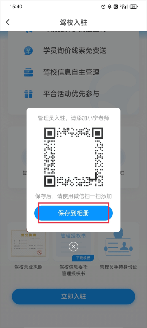 3、这时候会跳出来一个二维码,你把它存到手机里,再用微信扫一下,加上管理员就能办入驻了。弄好之后,你的驾校就能在上面招生啦。