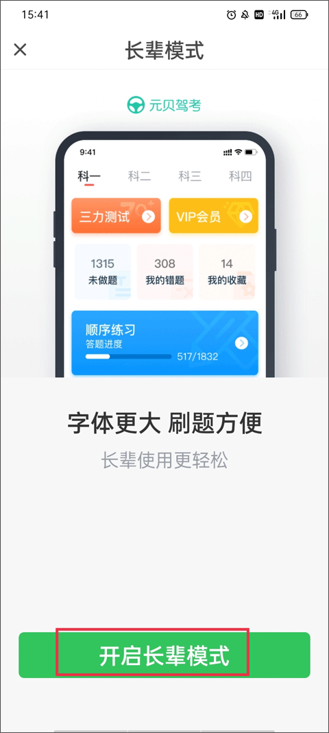 2、这个模式主要是字变得超大,刷题看起来不费劲,很适合家里的长辈用。直接点下面的“开启长辈模式”按钮。
