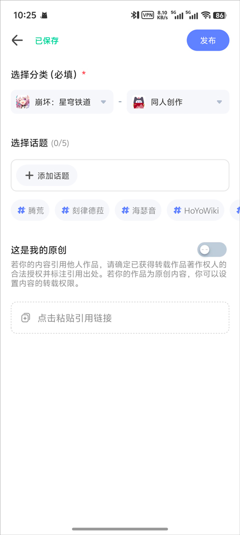 4、都写好了就点下一步,给帖子选个分类和话题标签,最后戳右上角的发布。