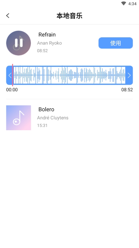 3、从你手机的本地音乐里,挑一首跟视频氛围搭的。一般都需要裁剪一下,选好高潮部分就可以用了。