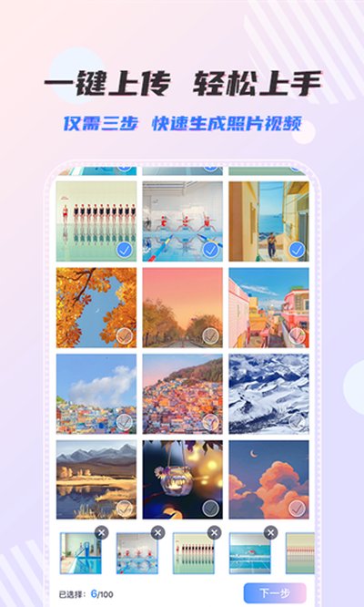 3、接下来就是上传素材的环节了。APP会提示你需要多少张照片或者视频,最好是按它的数量来,这样最终效果最贴合模板。