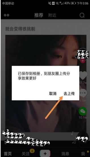 3. 它会先提示你得把视频存到手机里才行,你点同意,然后它会显示一个【去上传】的按钮,点它。