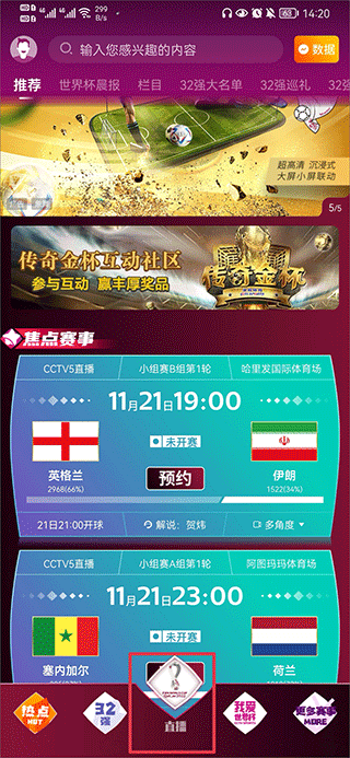 1、打开这个看卡塔尔世界杯直播的App,在主页下边那一排菜单里,找到“直播”两个字点一下。