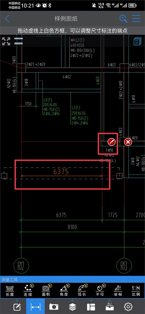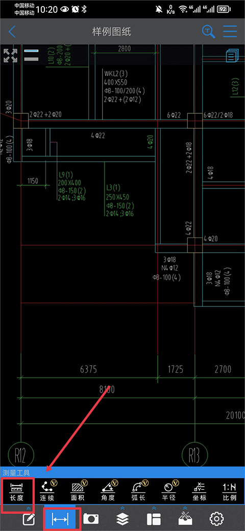 2、进去之后,双指把图纸放大到你要测量的位置,然后在下面那一排工具里,找到“测量工具”,再点“长度”。大家看下面这张截图。