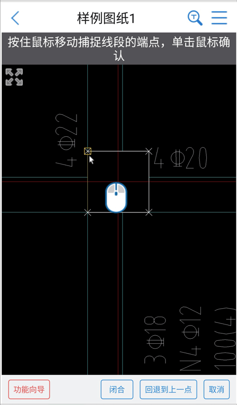2、这时候屏幕上会出现一个虚拟鼠标,用它来精确地点柱子的四个角点。四个点连成一个封闭图形后,点右下角的“测面积”按钮就行。