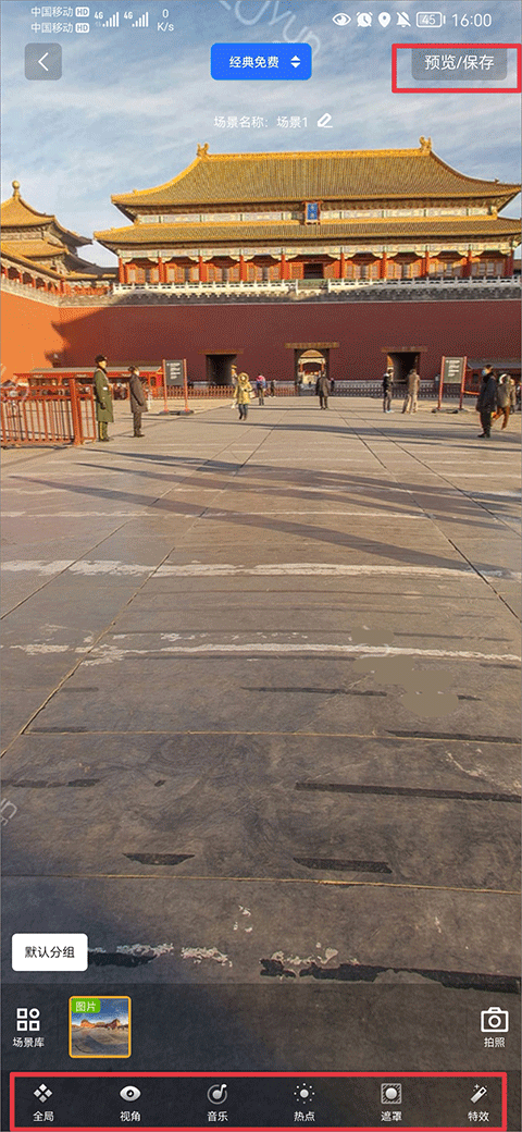 4、创建好了就进到编辑界面了,这里可以搞很多设置,比如调视角、加背景音乐、放热点链接、加特效什么的,让你的全景图更丰富。讲真,这里的设置选项有点多,刚上手可能得摸索一下。弄完之后就点右上角的“预览/保存”。