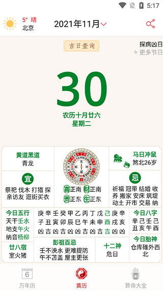 4、十二生肖每天的运势分析、未来半个月的天气预报、每日宜忌和时辰吉凶,还有个每日运势预测,功能挺杂的。