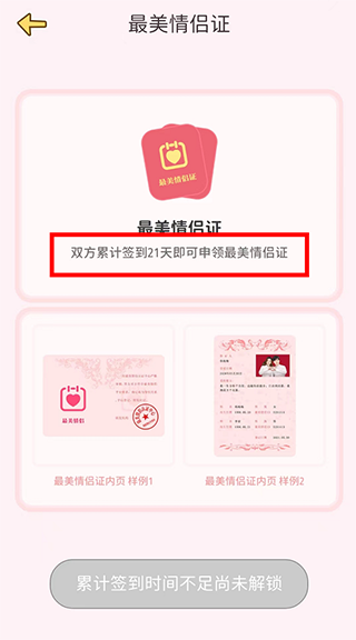 6、签到满21天,即可至个人中心页面申请最美情侣证。