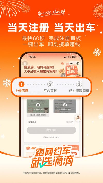 5、最后一步就是上传资料了。把你之前准备好的身份证、驾驶证、行驶证和车辆照片按顺序传上去,再选一下你的车是什么颜色的,点提交就行。接下来就是等平台审核,通过了你就算正式注册成功了。