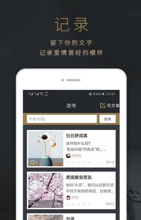 恋书最新版是此刻非常重要的一款恋爱交友互动软件。在这款中坚守一份真诚的心,采用多种人工审核认证,在寻找心仪的对象同时,还能够记录自己的情感故事,把万千情愫化做文字,来获得最宝贵的记忆,想要的都可以直接来此下载。