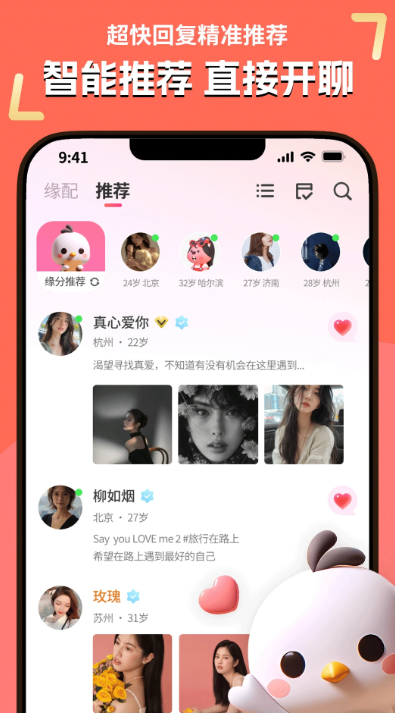 缘配app是一款非常优质的社交平台,里面有着众多实名认证的用户,信息都是真实有效的,多种聊天互动玩法,用户们可以随时随地的来线上进行交友,并且还能遇见自己的心动呢。