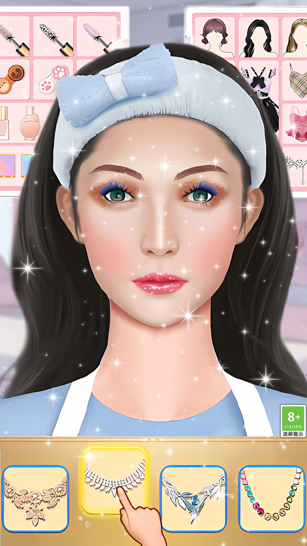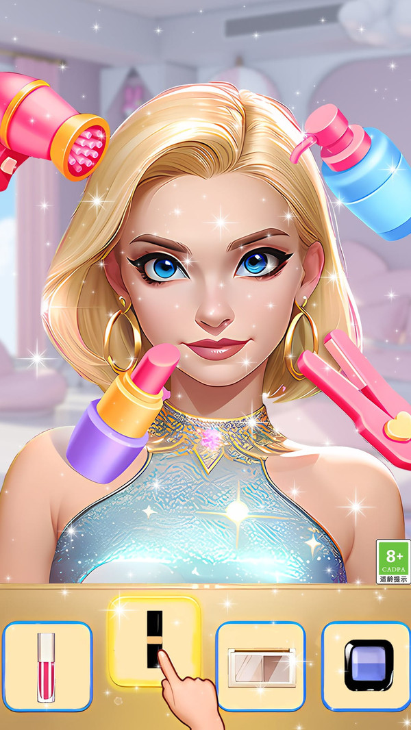 2、提供各种化妆品,如眼影、唇膏、腮红,支持色彩自由组合,尝试日常、晚宴、舞台等不同风格;