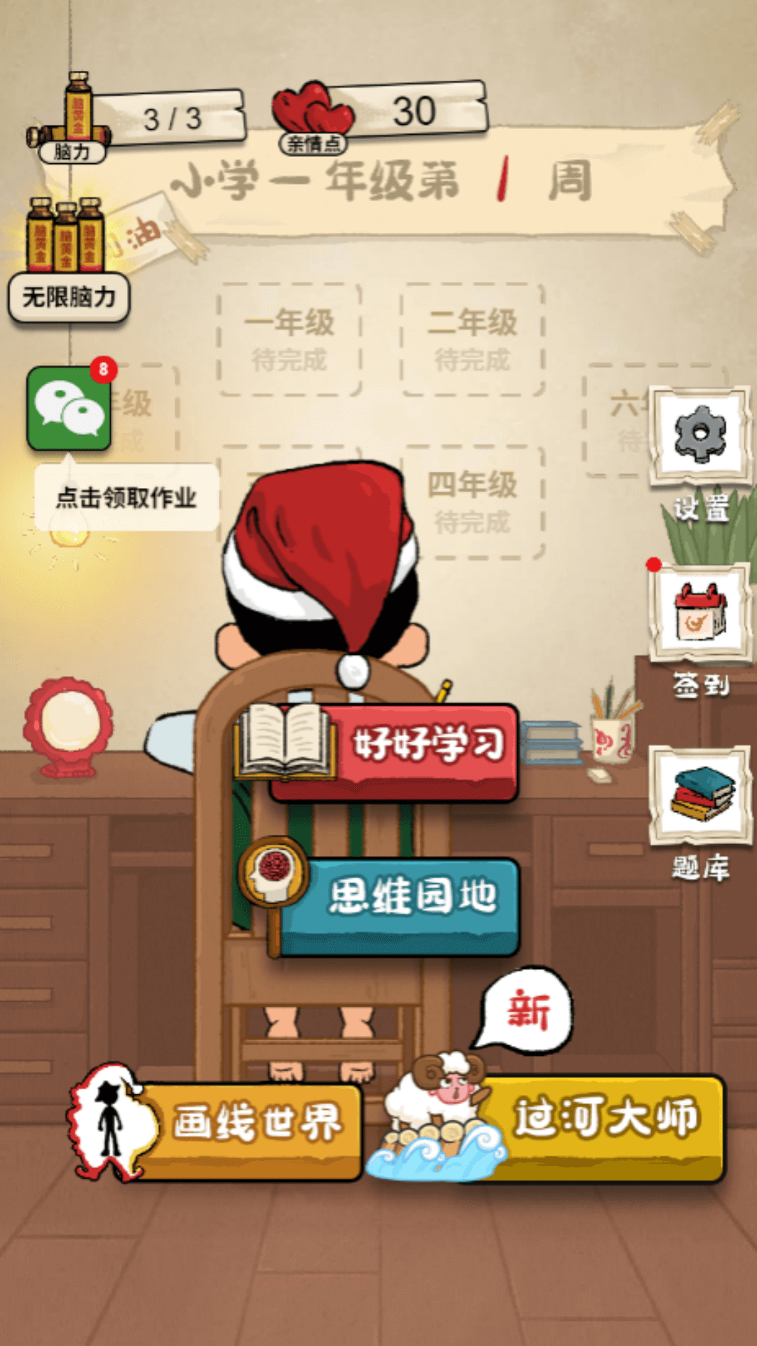 智力有亿点儿是一款别出心裁的魔性休闲益智游戏,带你穿越回童年课堂,化身头戴圣诞帽的小学生,在家长的深情注视下完成一场惊心动魄的作业大作战。从一年级的加减法到六年级的应用题、造句、音乐节奏,各科题目轮番上阵,考验你的反应与知识储备。独特的亲情值系统让答题过程充满紧张感,答错或超时都会消耗家长耐心,一旦归零,迎接你的将是爆笑又扎心的灵魂吐槽,甚至突如其来的爱的教育。手绘卡通风格搭配夸张表情和搞笑剧情,既还原了童年的作业焦虑,又以幽默方式化解压力,让你在笑声中挑战脑力极限。