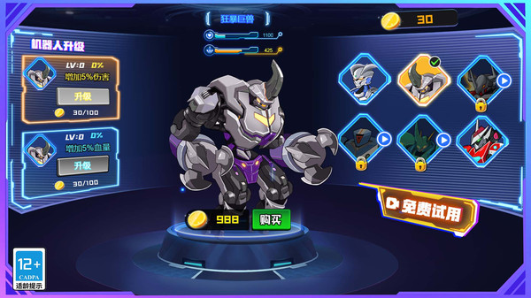 2、通过比赛获得资源,可用于解锁新机甲或强化现有角色的攻击力、防御力等基础属性,提升战斗力。