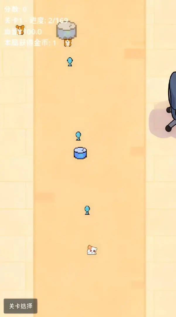 1、进入游戏,像素风格的场景射击,控制游戏中的猫猫开始射击。