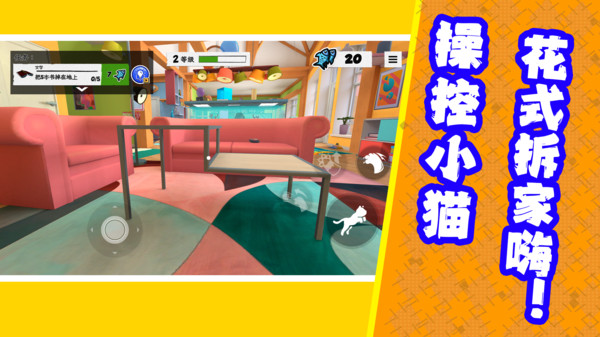 3、方向键控制猫咪在家中自由探索,完成吃鱼挑战。