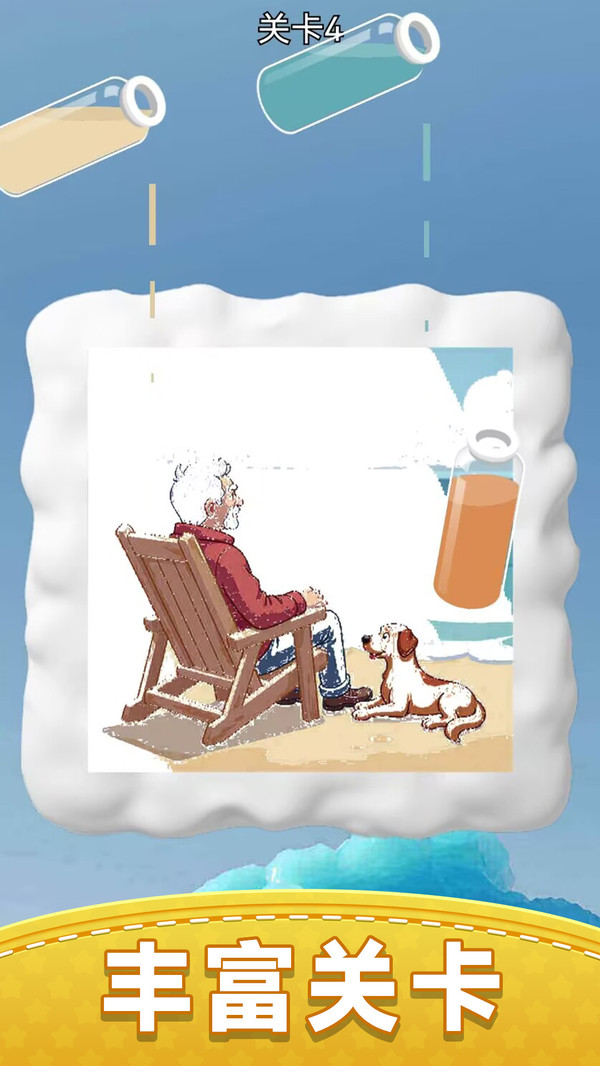1、倒水时液体流动的动画、试管满时的咕嘟音效、颜色不匹配时的瓶子晃动提示,增强操作真实感;