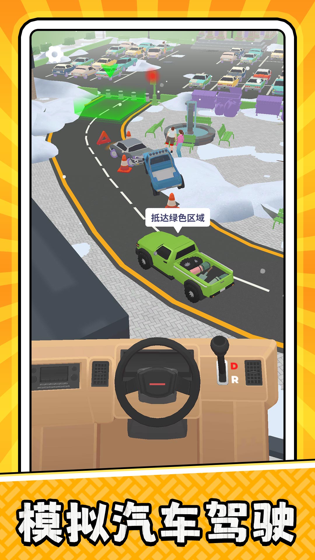 1、进入游戏,点击控制游戏的车辆到达指定的绿色区域,成功的停车即可完成人物。