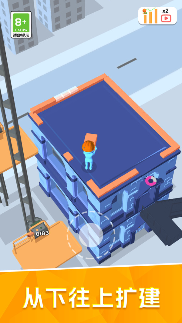 1、游戏以搬砖为核心玩法,玩家通过简单操作,如点击、滑动控制角色搬运砖块,完成建筑搭建;