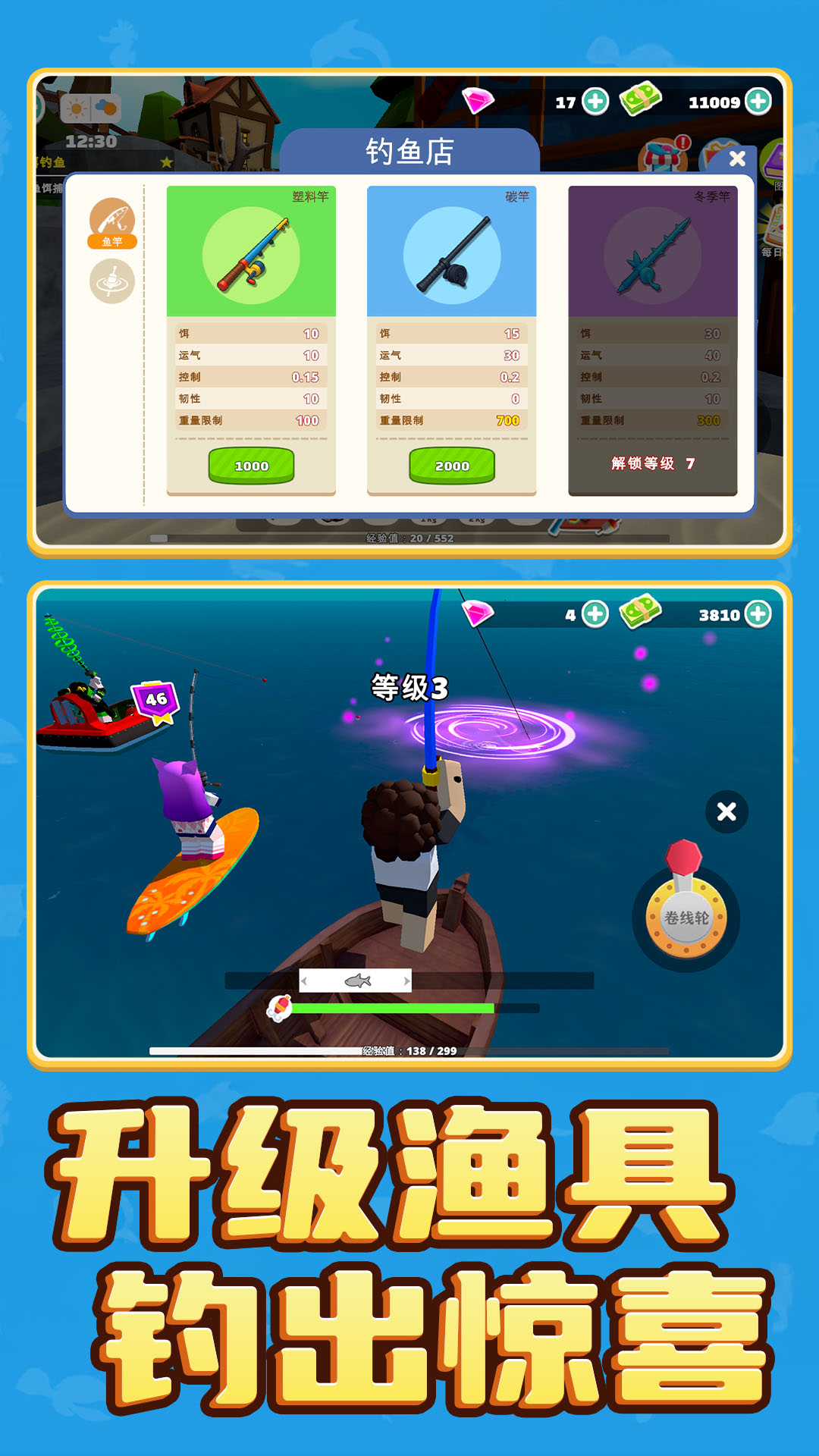 3、游戏中设有独特的钓鱼装备系统,轻轻一点,即可选择并升级你的钓竿、鱼线与鱼饵,每一次选择都是对未知的挑战与期待。