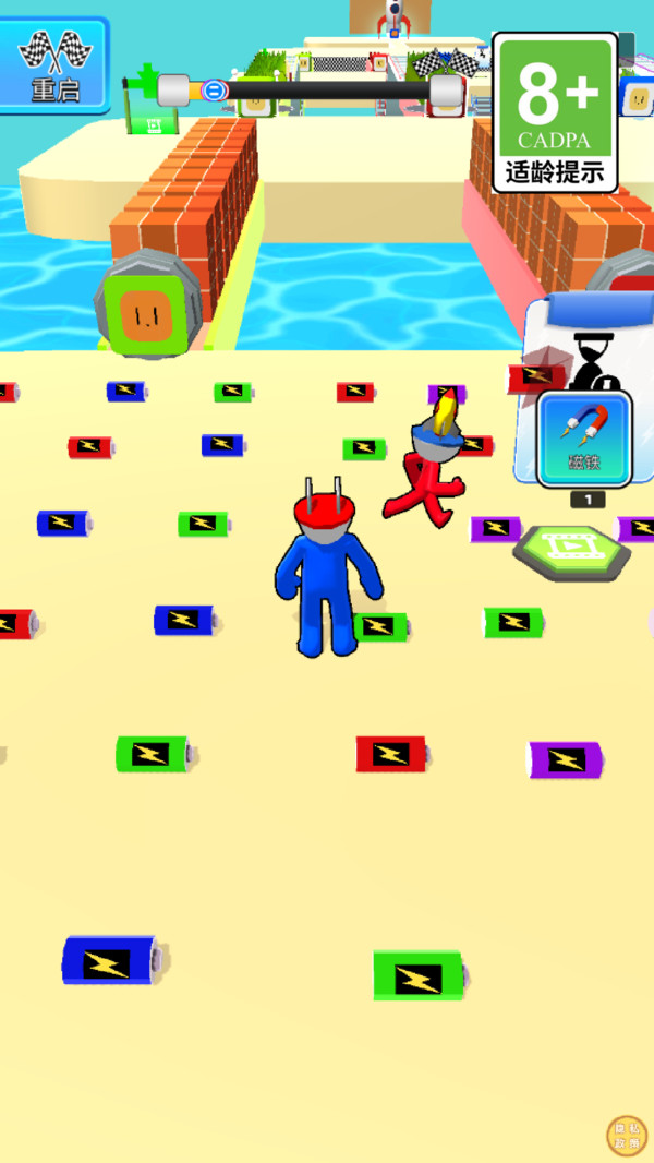 快乐冲刺赛是一款轻松有趣的休闲竞技游戏。玩家将扮演造型独特的插头人角色,在充满未来感的赛场上展开激烈角逐。你的目标是在限定时间内收集散落各处的电池能量,巧妙摧毁沿途障碍,最终冲向终点火箭赢得胜利。游戏以明快的卡通风格呈现,结合简单的操作与充满策略性的收集对抗,打造出适合全年龄段的欢乐竞技体验。在每个关卡对战中,你需要尽可能的最快到达终点。