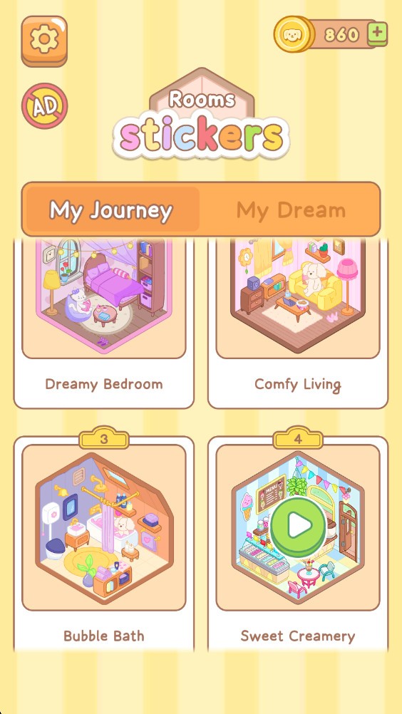 房间贴纸是一款以即时创意落地为核心的休闲设计游戏,它巧妙地将现实家居改造的繁琐过程转化为指尖的轻松拖拽体验。玩家无需学习复杂操作便能快速进入设计状态,游戏中所有装饰元素均采用即选即用模式,当玩家选中某张复古花纹壁纸时,房间墙面会瞬间完成材质更换与光影适配。这种零延迟的视觉反馈机制持续激发着玩家的创作欲望,每次搭配不同风格的家具组合时都能实时看到整体空间氛围的转变。超过万种的装饰素材库支持多层叠加设计,允许玩家在简约现代沙发上方悬挂波西米亚风挂毯,这种跨风格混搭设计正是游戏最独特的魅力所在。