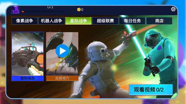 1、参与到像素战争、机器人战争、星际战争、超级联赛多种模式中,玩转像素射击竞技。