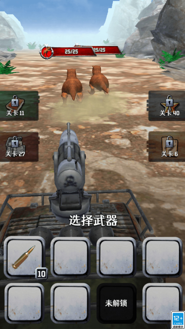 1、在关卡挑战中,玩家需要点击载具上的武器进行选择,使用武器对野兽发起攻击。