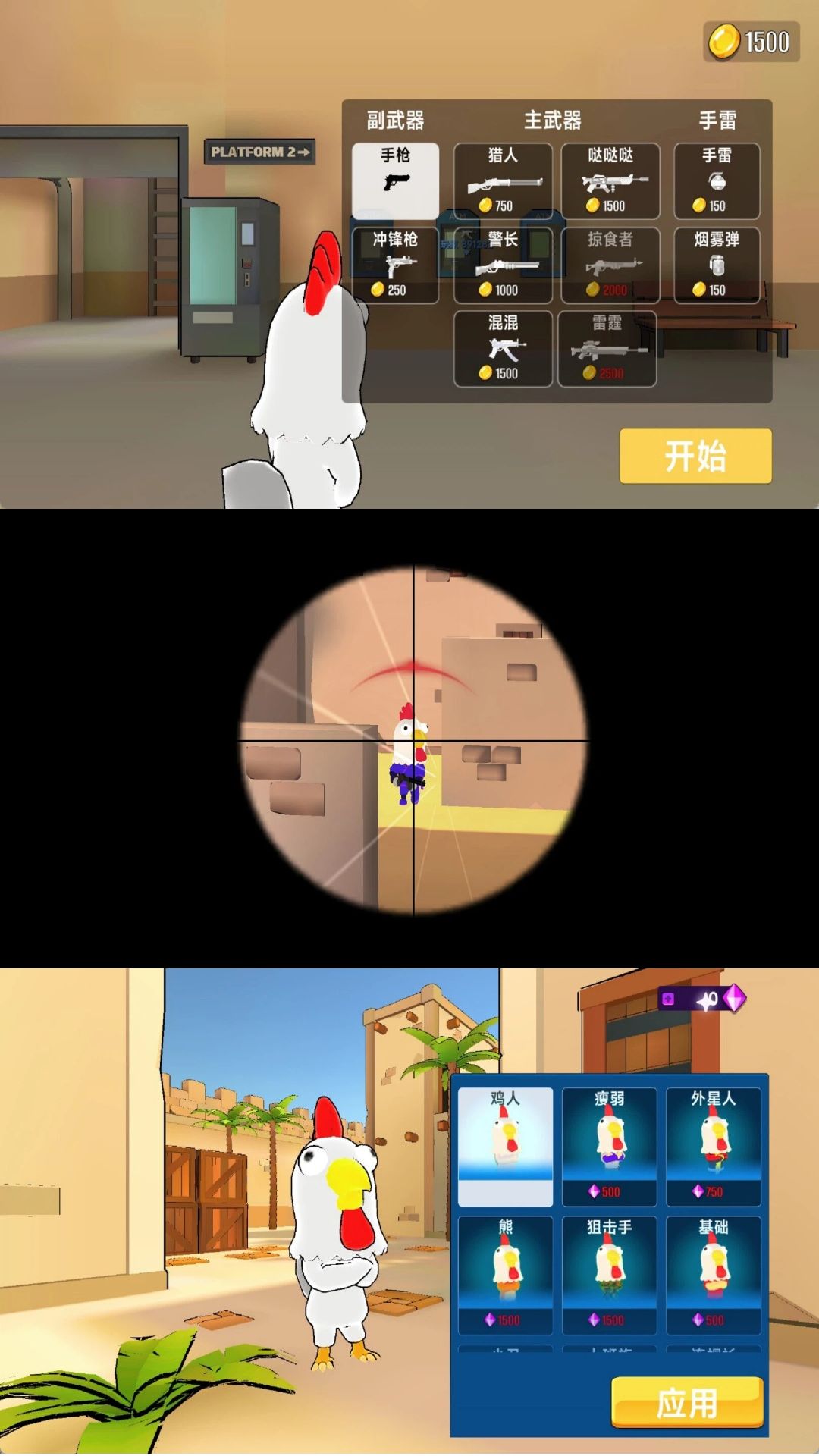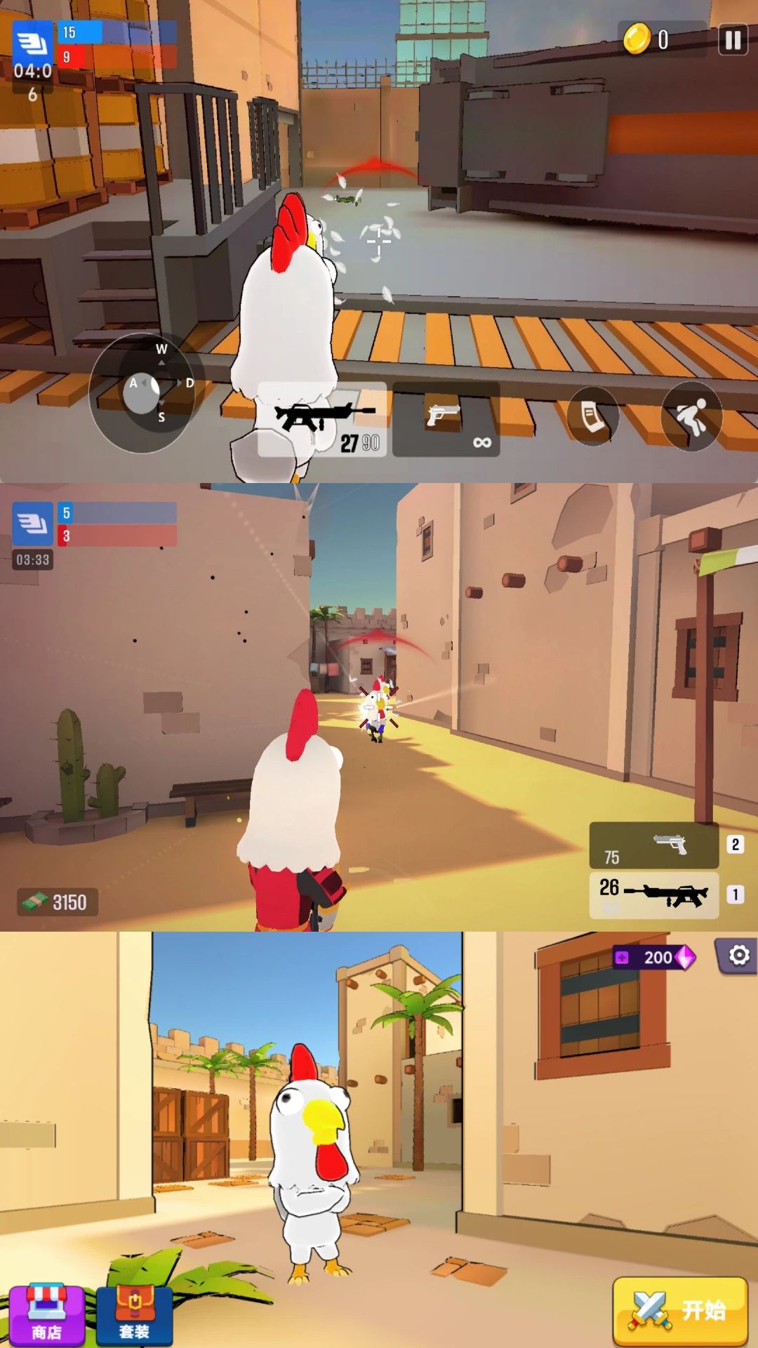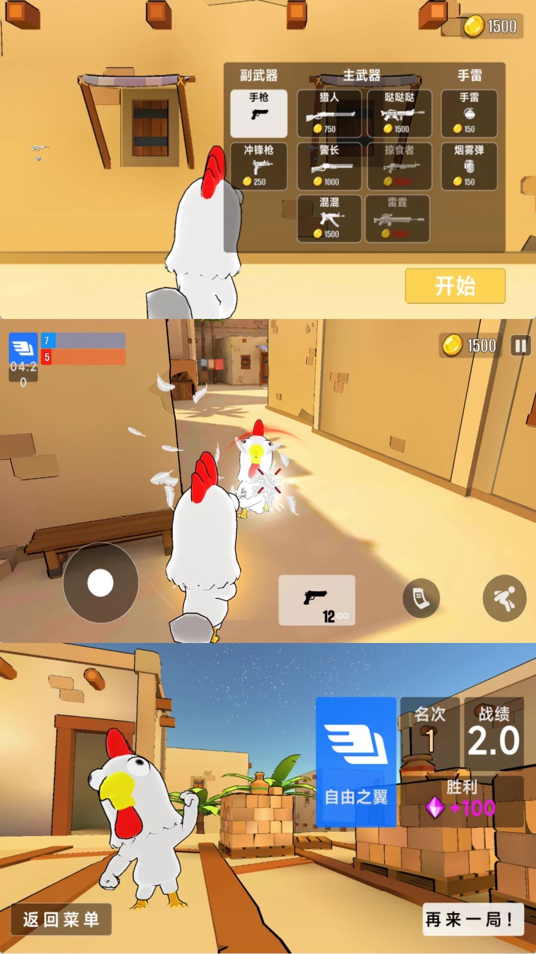 1、角色以搞怪小鸡形象呈现,每只拥有专属外观与微调属性,如移速、跳跃高度或装弹速度。