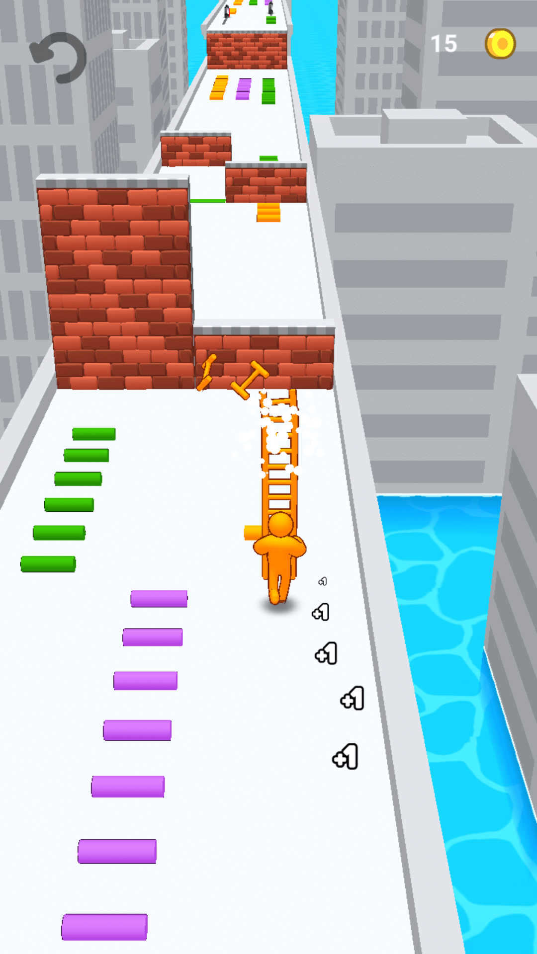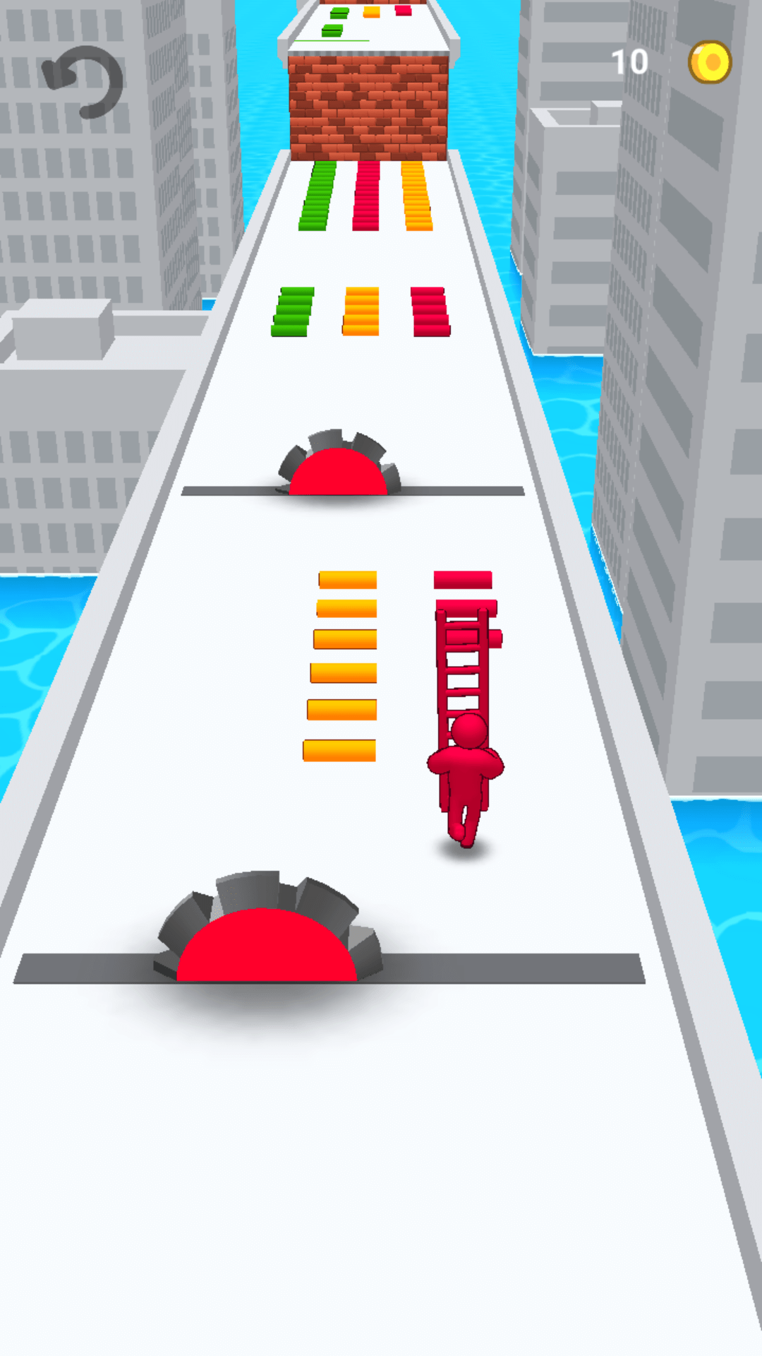 2、收集路上的木块,到达障碍墙,变化梯子跨越。