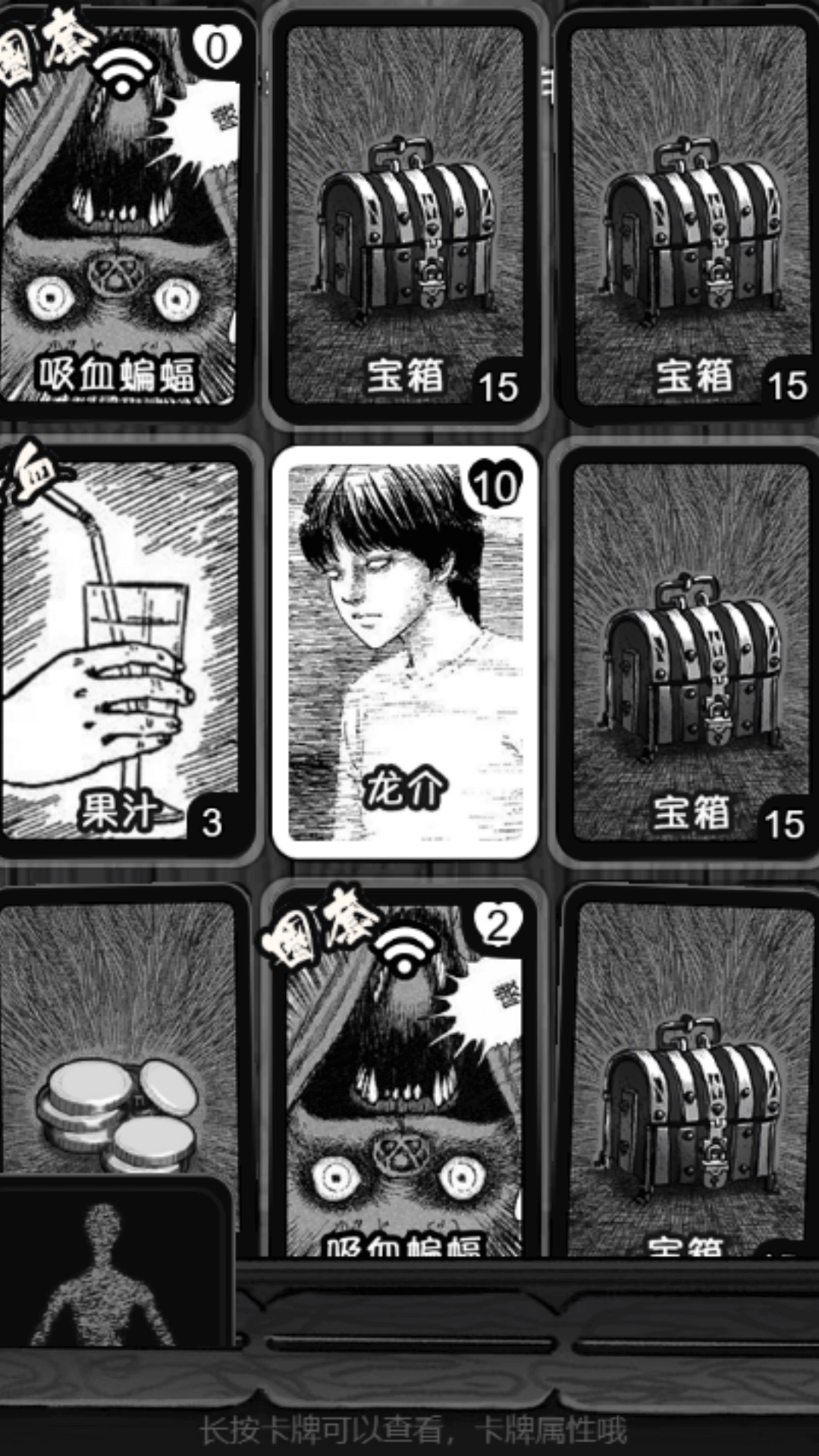 诡异的卡牌是一款以独特的黑白画风为核心特色的恐怖冒险游戏,结合克苏鲁神话的诡谲氛围与卡牌策略玩法,打造出沉浸式恐怖体验,昏暗色调与交错光影构建出压抑环境,如阴森的档案室、迷雾笼罩的街道等,配合碎片化叙事剧本隐藏于隐藏关卡中,增强探索的未知感,在这里到处的冒险,完成挑战。
