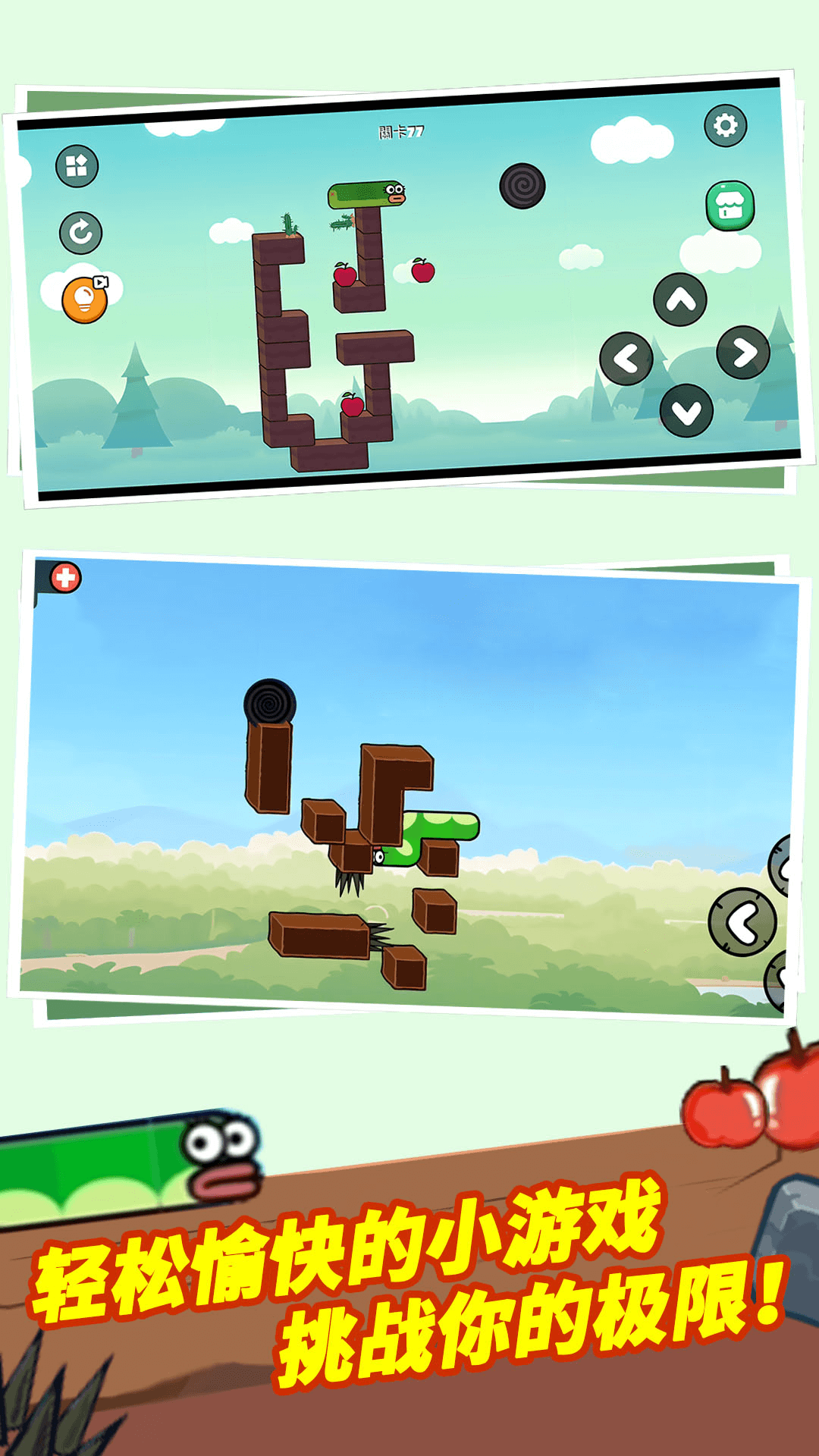 2、通过右侧的按键来控制小蛇移动,吃食关卡中的苹果增长体型,到达关卡门处。