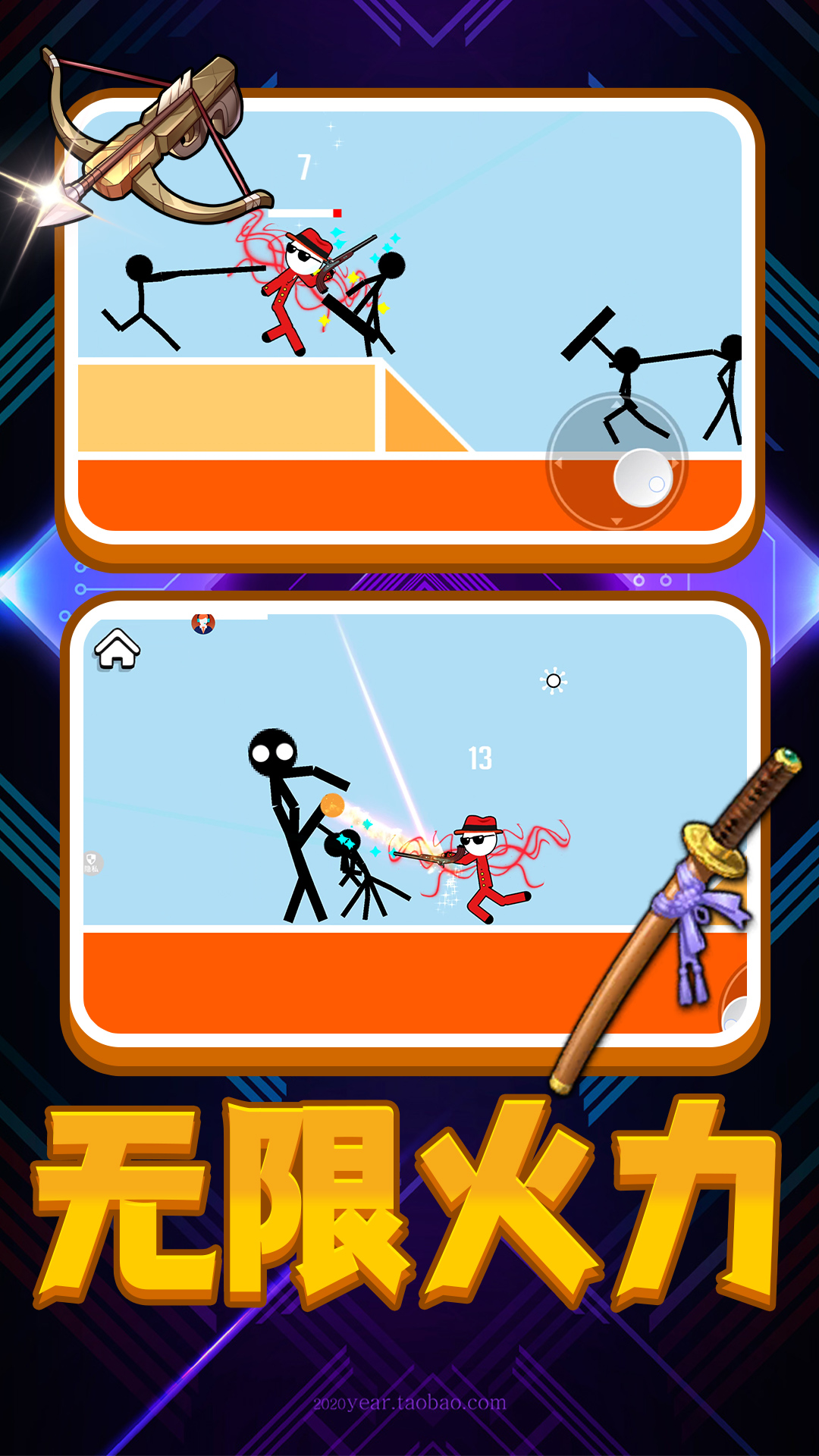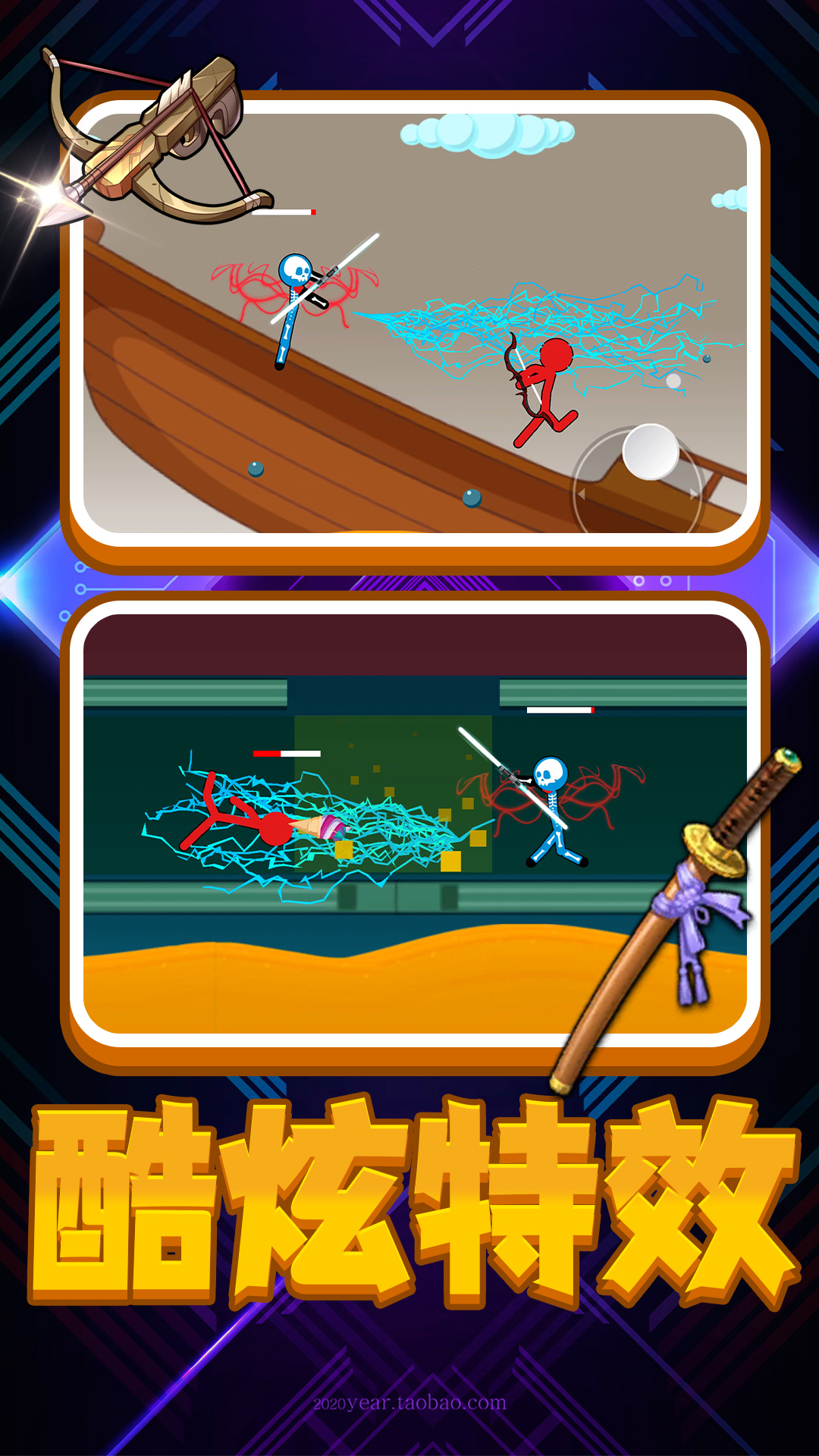 1、操控你的火柴人角色,施展迅捷的拳脚连招、华丽的空中追击、以及破坏力惊人的必杀技;