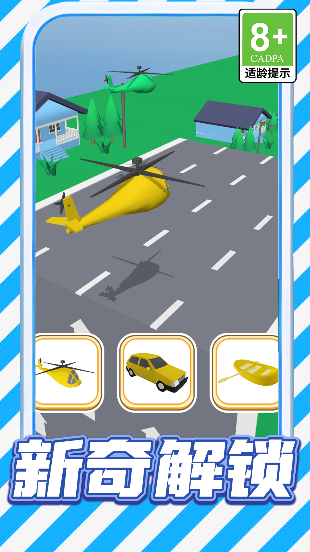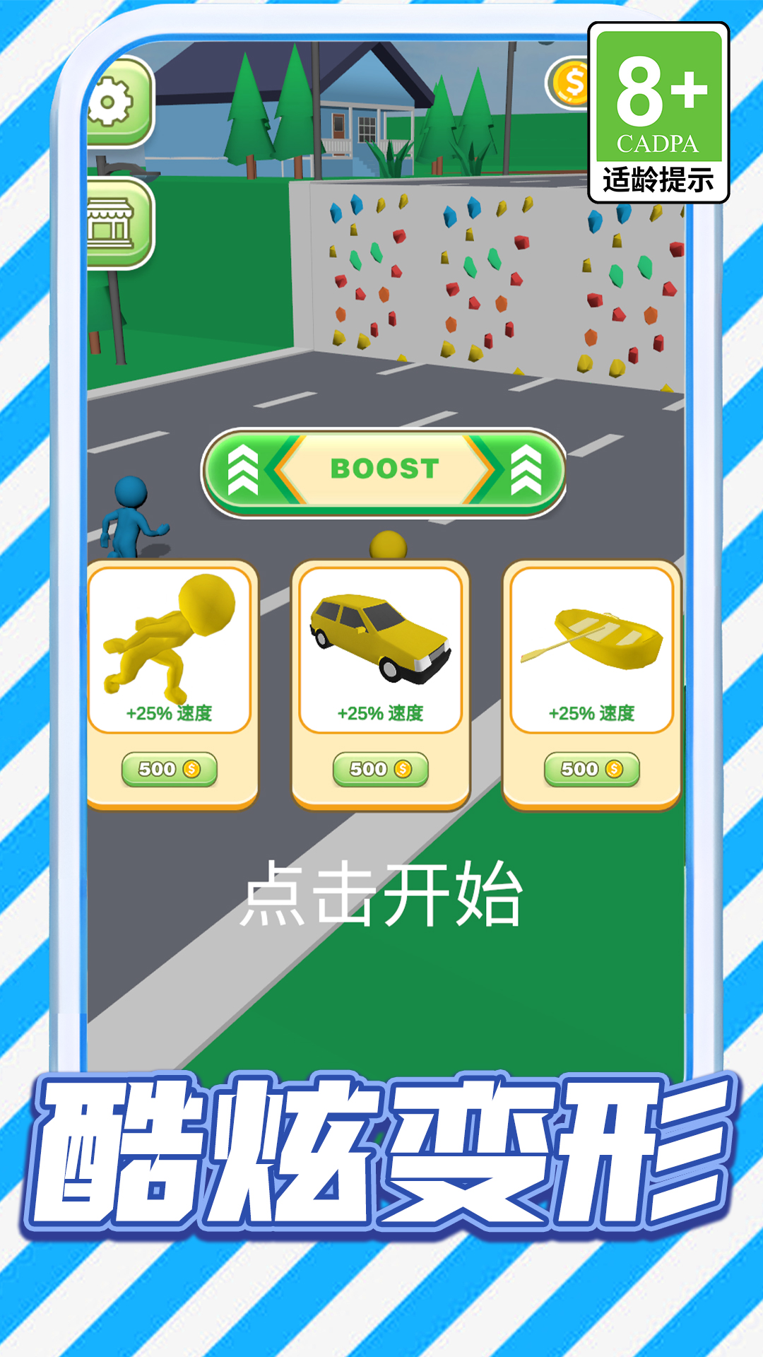 我最能通关是一款以形态切换为核心玩法的跑酷闯关游戏,玩家通过操控可变形的角色,如汽车、飞机、船舶等,应对不同地形与障碍,结合策略操作与道具收集,完成高难度闯关挑战,需根据关卡地形,如悬崖、河流、气球阵提前预判,错误变形会导致失败,如飞机飞入水中,积极的冲刺,顺利的抵达终点,体验胜利的欢呼。