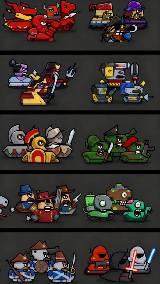1、各自代表不同文明时代的坦克军团进行对战,石器投石车与未来机甲的同场较量,考验战术适应能力。