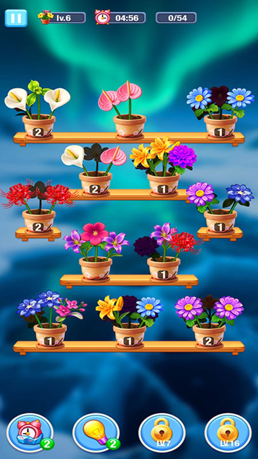 2、 通过手指直接拖动一朵花,将它放到其他相同颜色的花盆里,达到三朵即可消除。