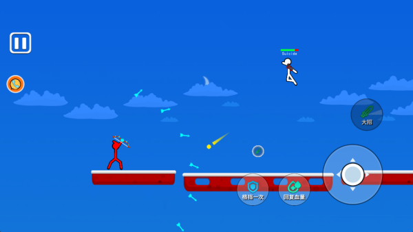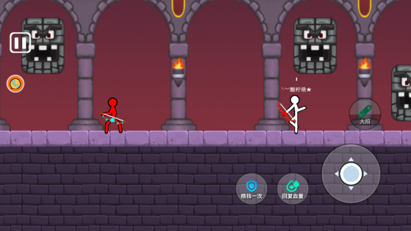 1、玩家通过屏幕左侧的虚拟摇杆控制火柴人移动,通过灵活的移动躲避敌人攻击并寻找进攻机会。