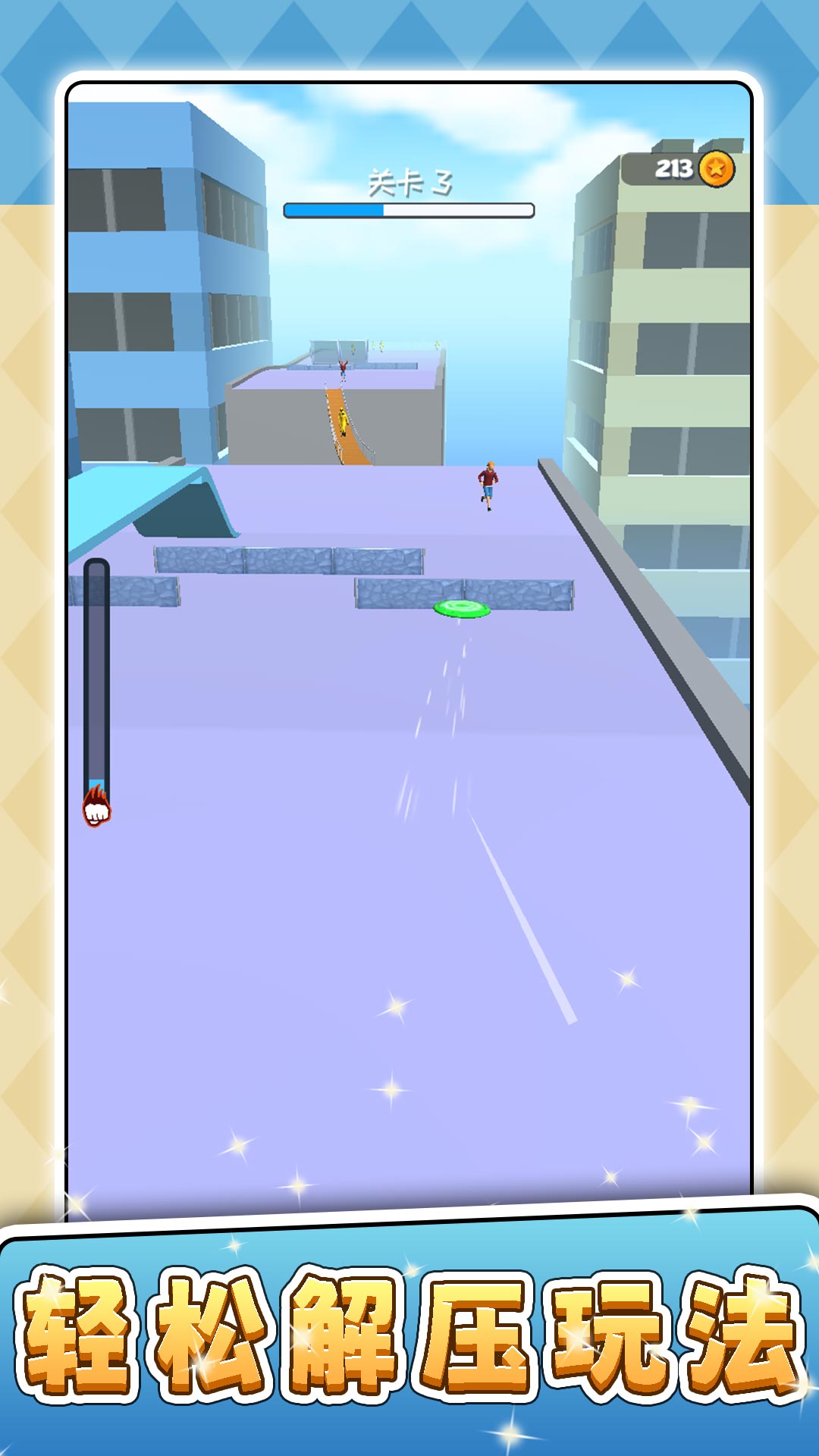 1、进入游戏,控制游戏中的小人开始移动,穿梭在房顶中,精准的扔球获取金币。