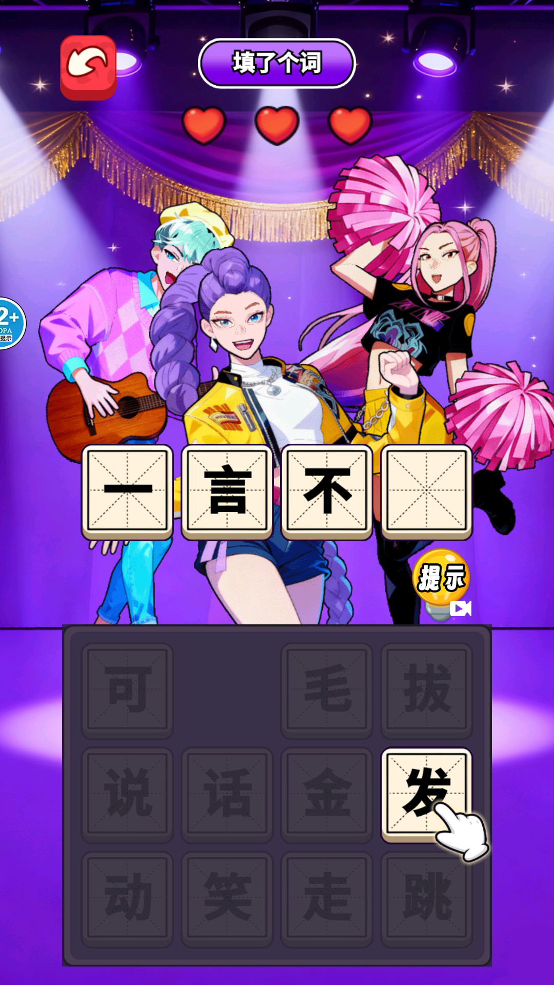 3、填入词语,如果有错误的话,可能就会闯关失败,只能重新开始。