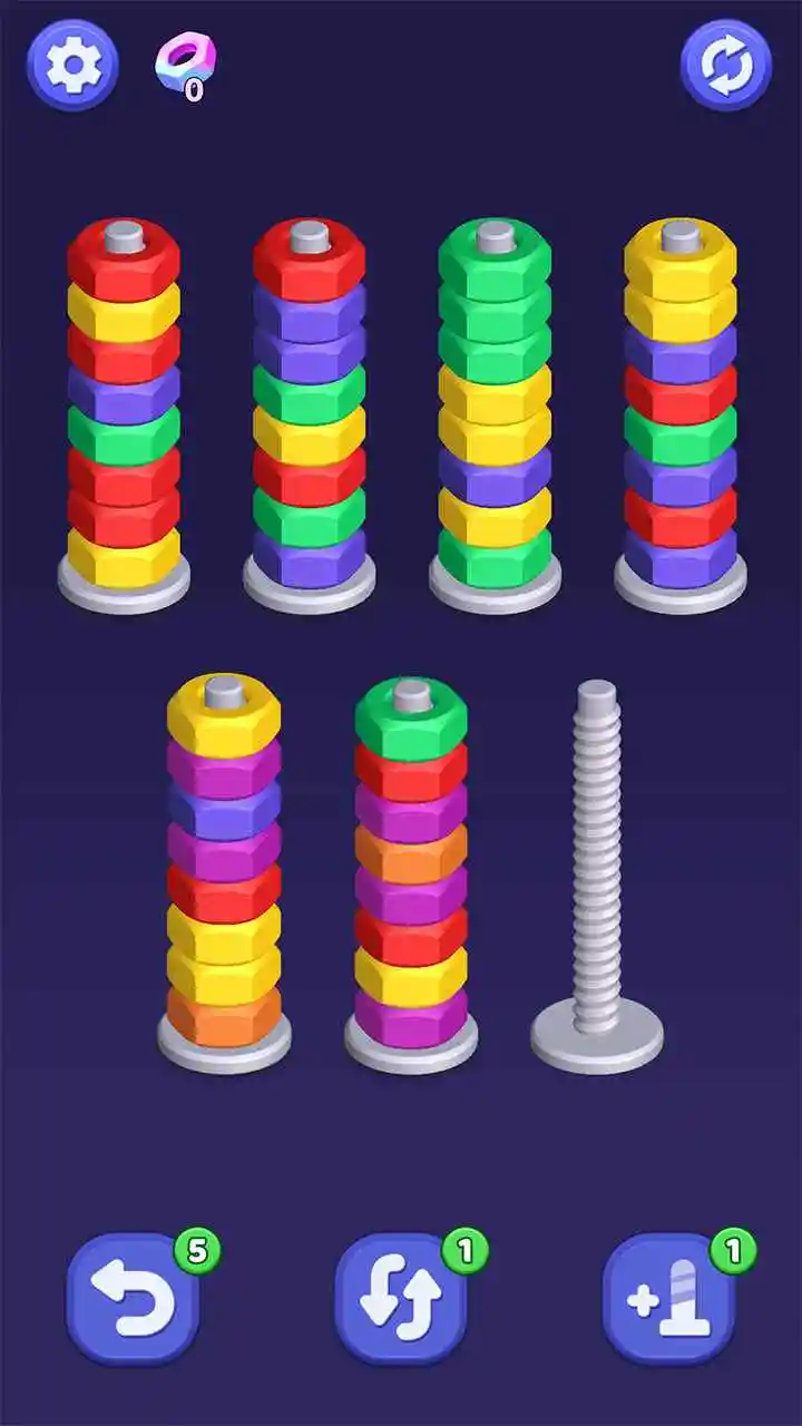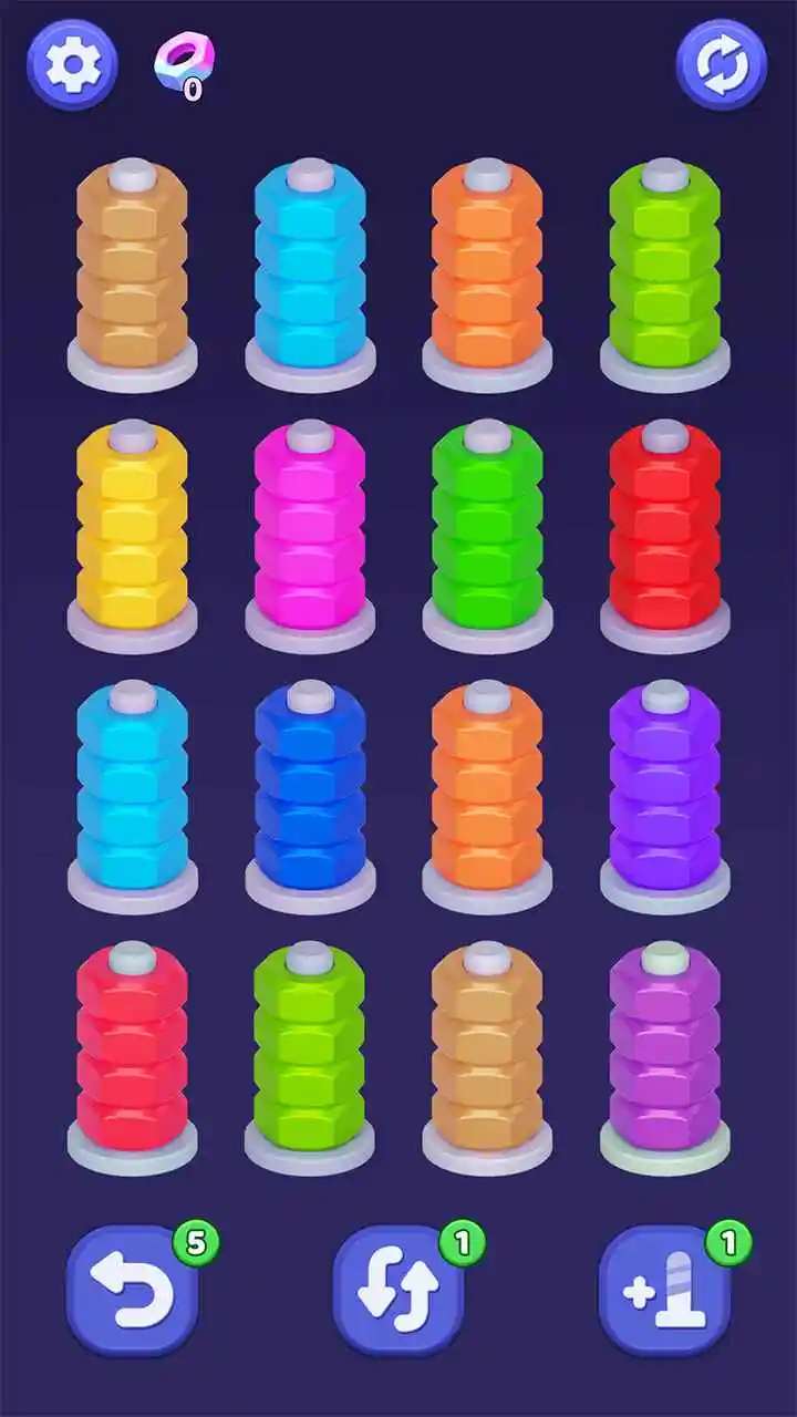 2、每颗螺丝由多层色圈组成,需逐层统一颜色并填满槽位,才能触发消除机制。