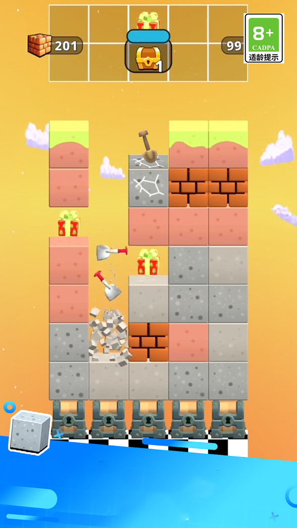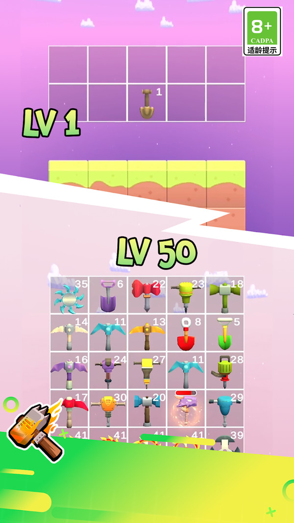1、玩家通过点击滑动上方的工具,用相同铲子进行合并获得更高级别工具。