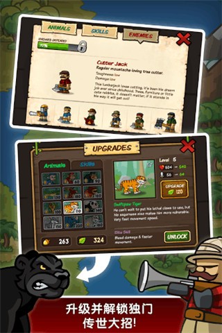 1、玩家需要指挥由多种森林动物组成的特色军团,在固定路线上阻击不断来袭的伐木工人与机械。