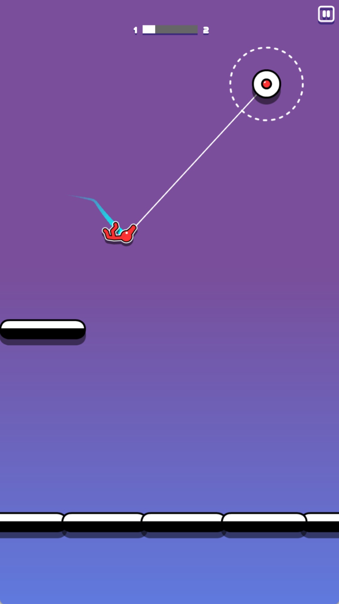 1、玩家通过点击屏幕,可以控制火柴人抓住节点,进行绳索摆荡。