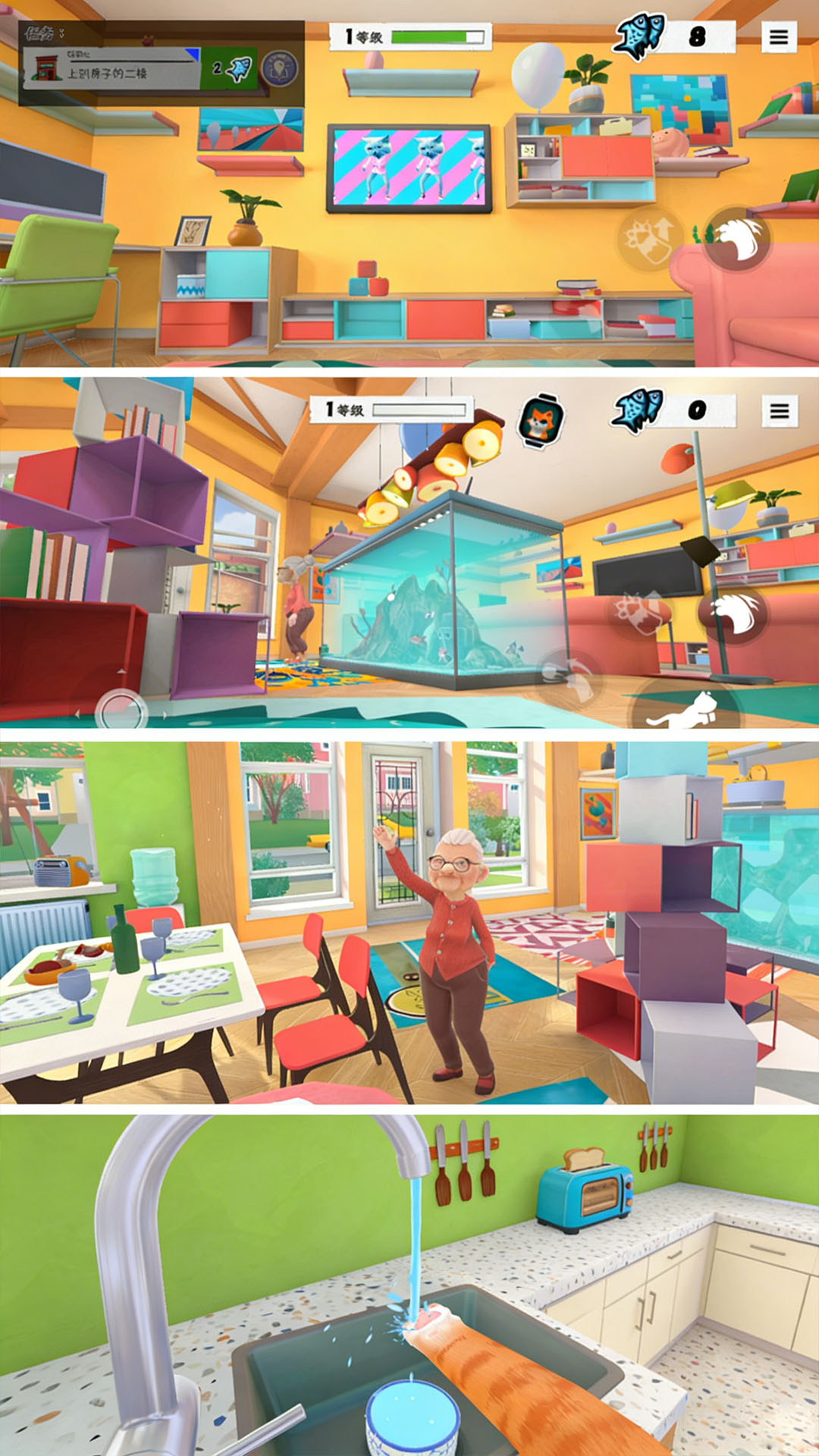 猫咪大暴走是一款在房屋里到处的捣乱冒险的休闲游戏,玩家化身调皮橘猫,以喵星人视角在老奶奶家中展开恶作剧,通过翻倒花瓶、打翻牛奶、乱抓沙发等行为制造混乱,感受随心所欲捣蛋的乐趣,例如推倒物品时,家具会因物理效果倾倒,增强真实感,每次恶作剧后需迅速躲藏,否则会被奶奶发现并追捕,带来全新的捣蛋体验。