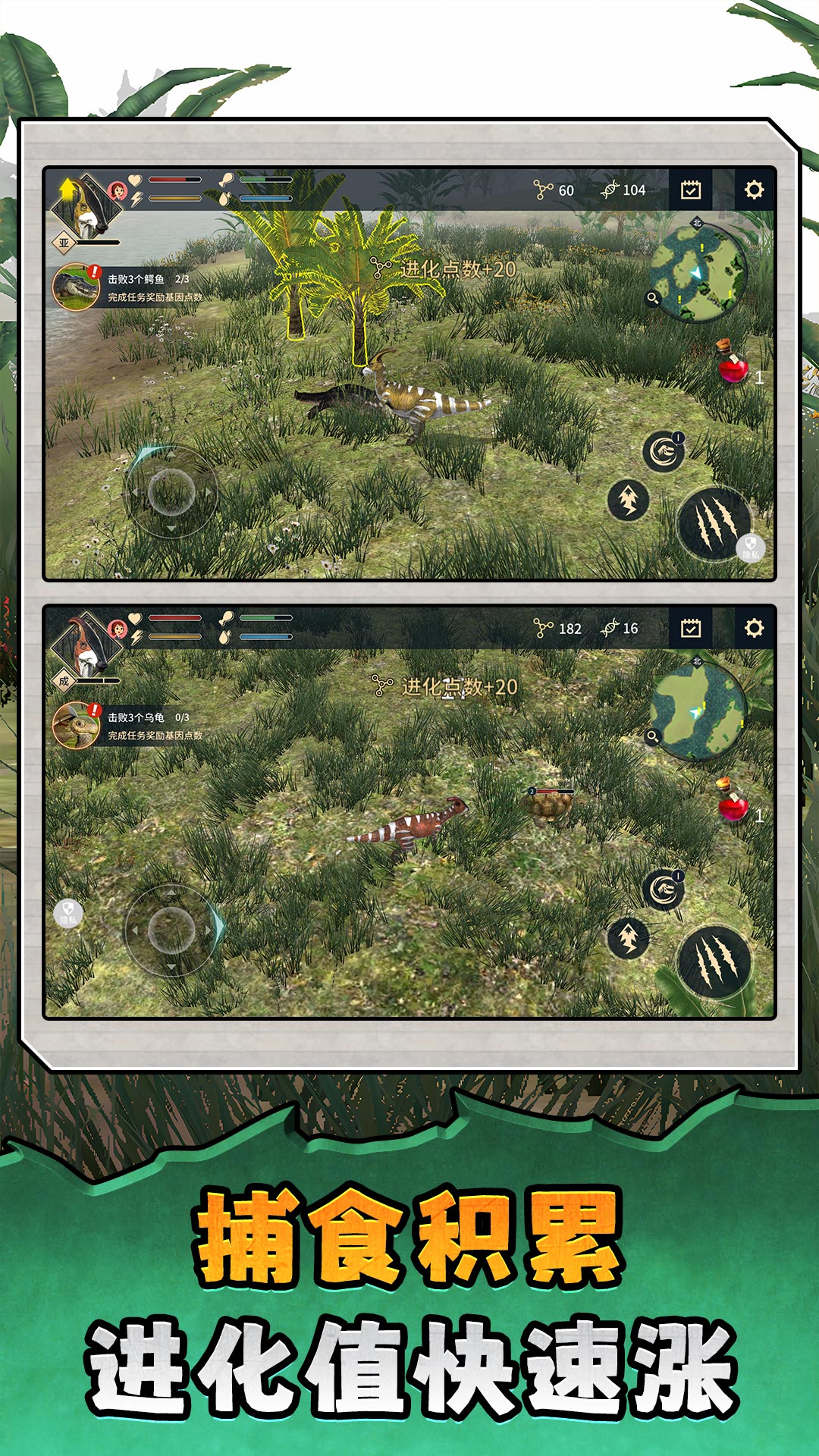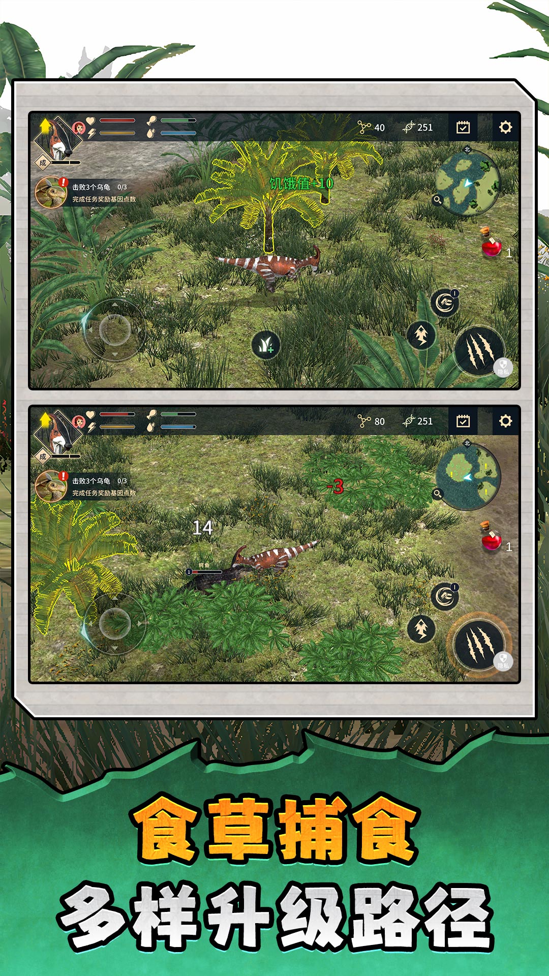 3、见证并操控自己的恐龙从一只弱小的幼崽,通过无数次战斗和抉择,一步步进化成为一方区域的顶级猎手或守护者。