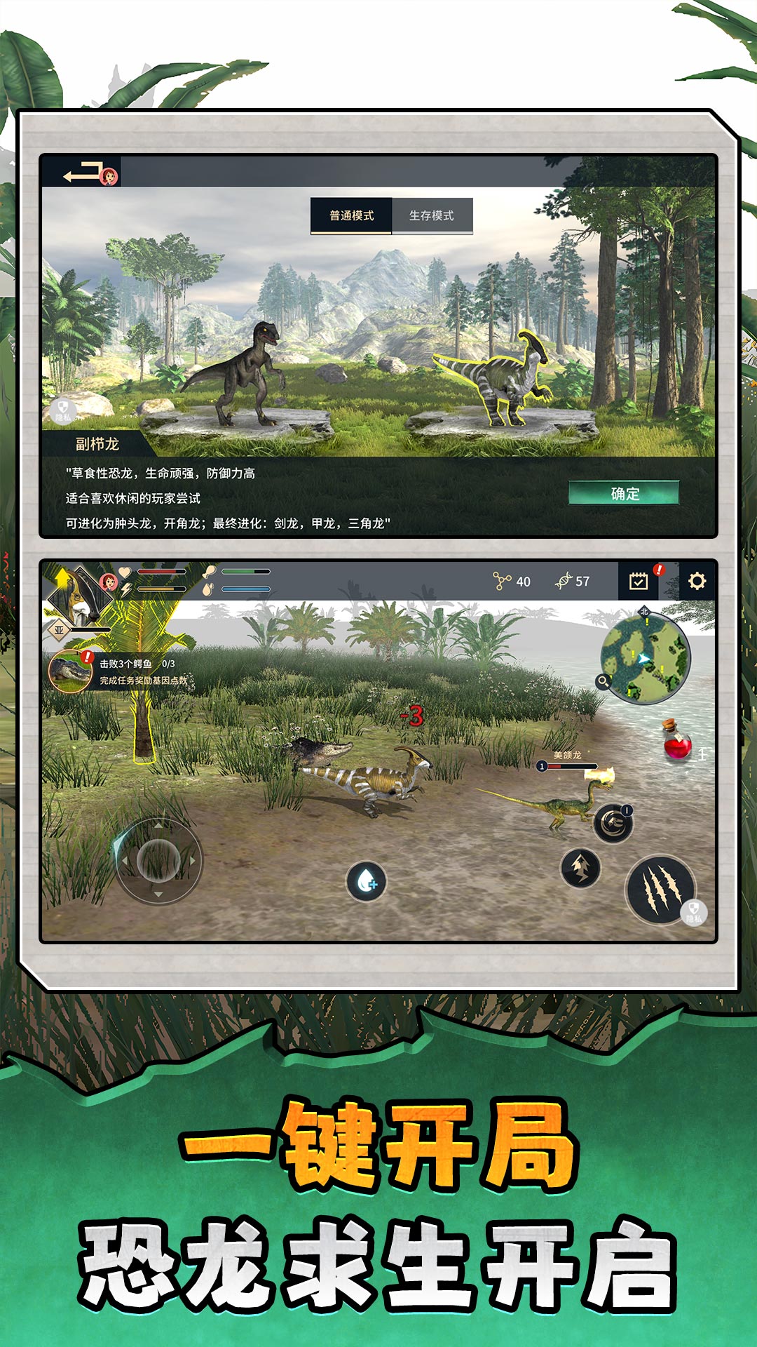 1、玩家可以在这里选择普通模式以及生存模式两种玩法,选择好你出生的基础恐龙开始冒险。