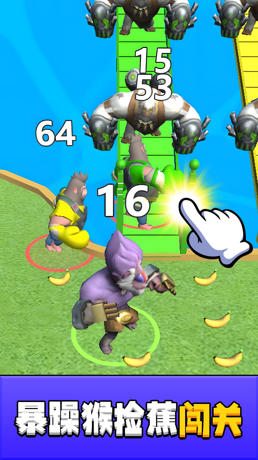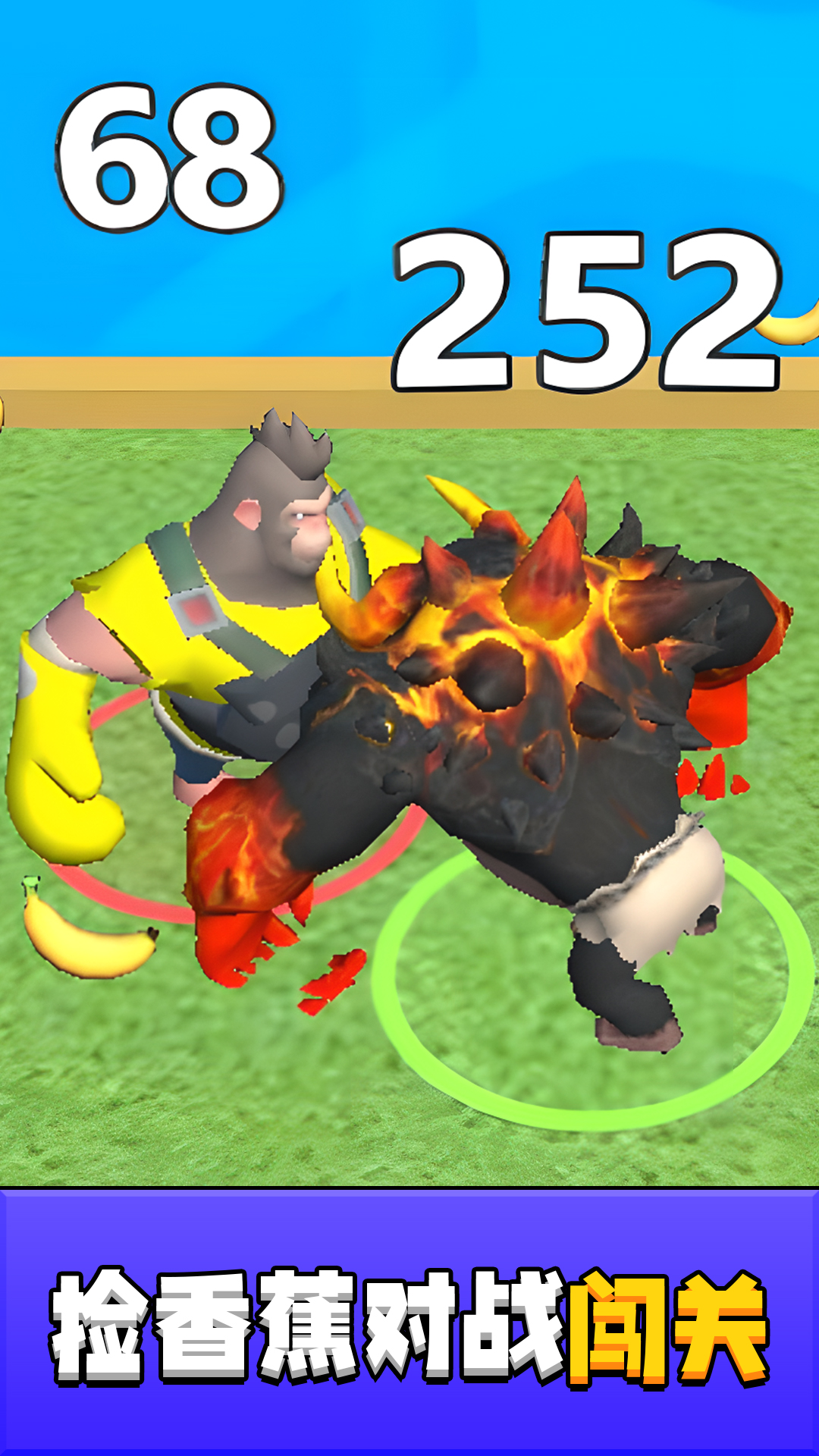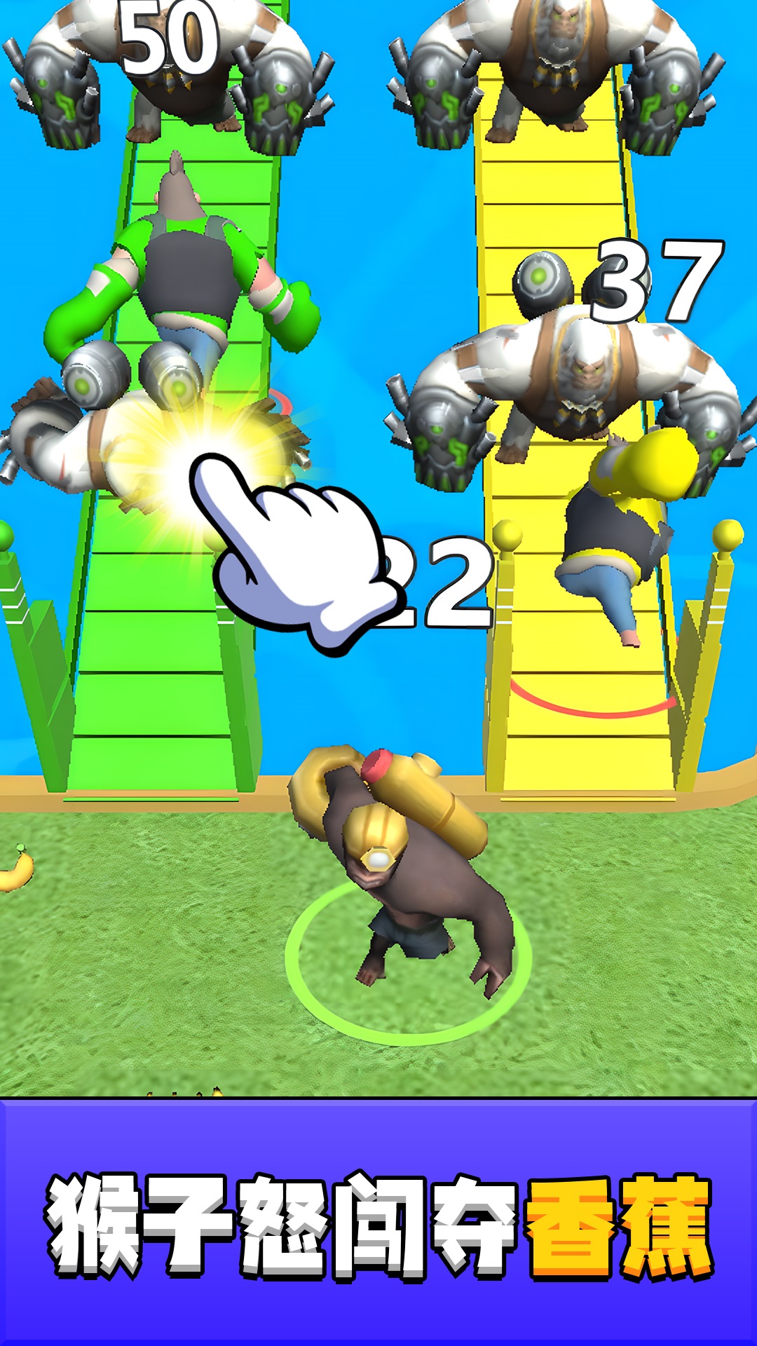 4、遇到其他猴子时,点击屏幕发动猴拳连击或香蕉投掷,抢先击倒对手夺取香蕉,还能触发狂暴模式短时间无敌冲刺。