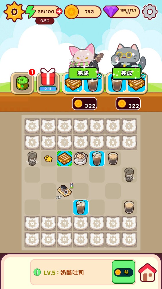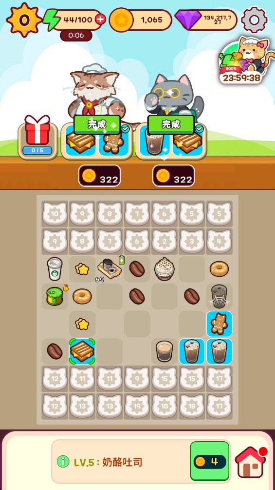 2、通过完成富有策略性的合并消除关卡,可以获得咖啡豆、牛奶等原材料以及全新的家具装饰。