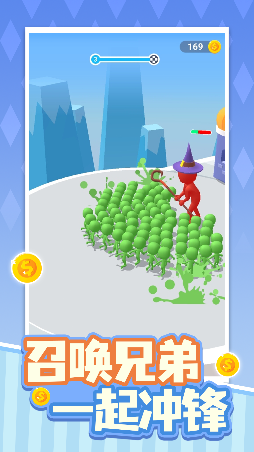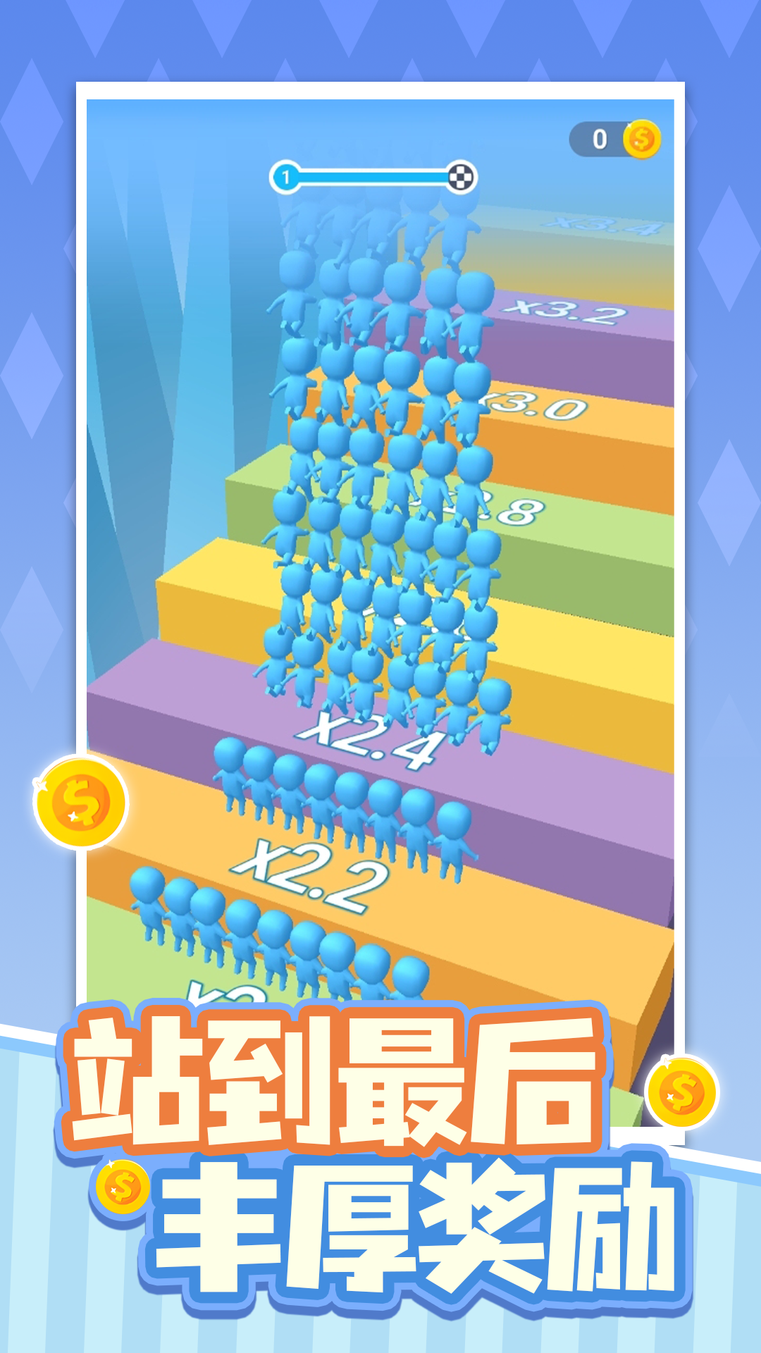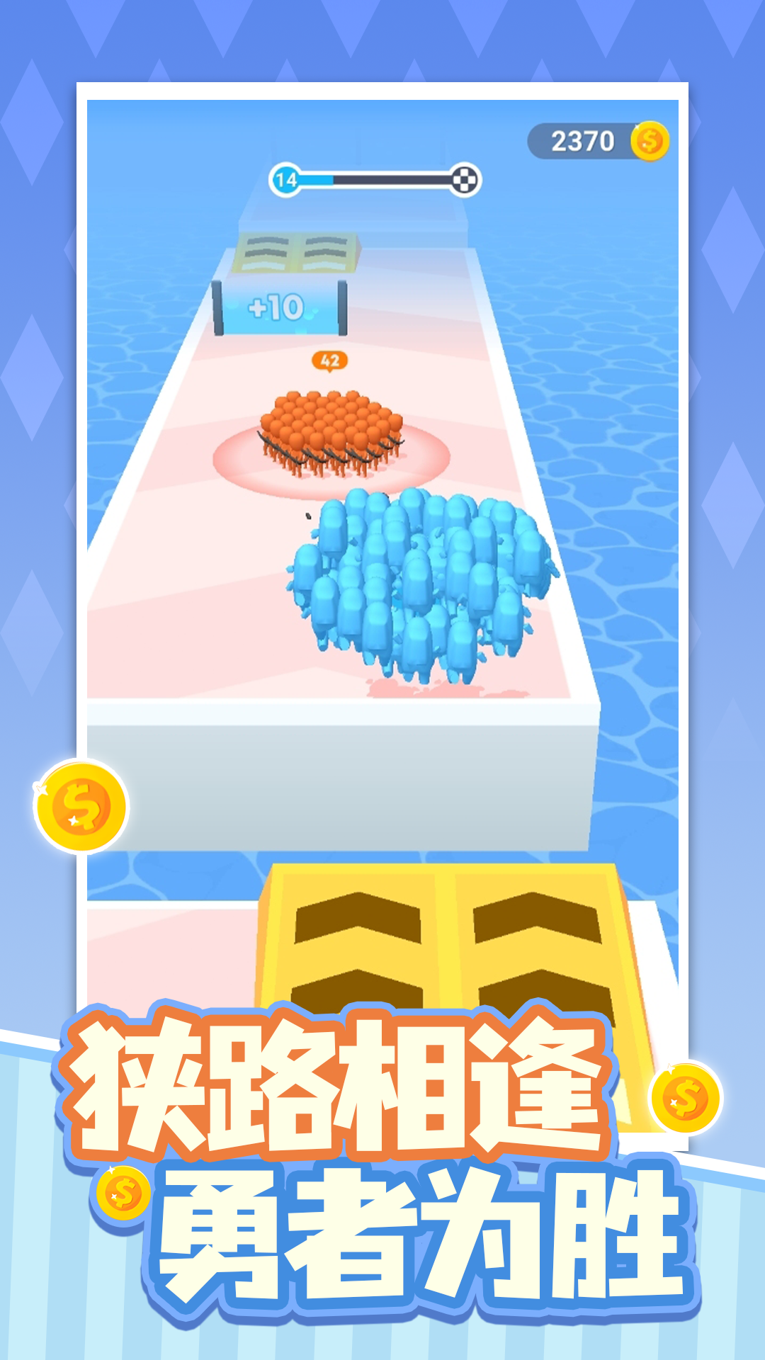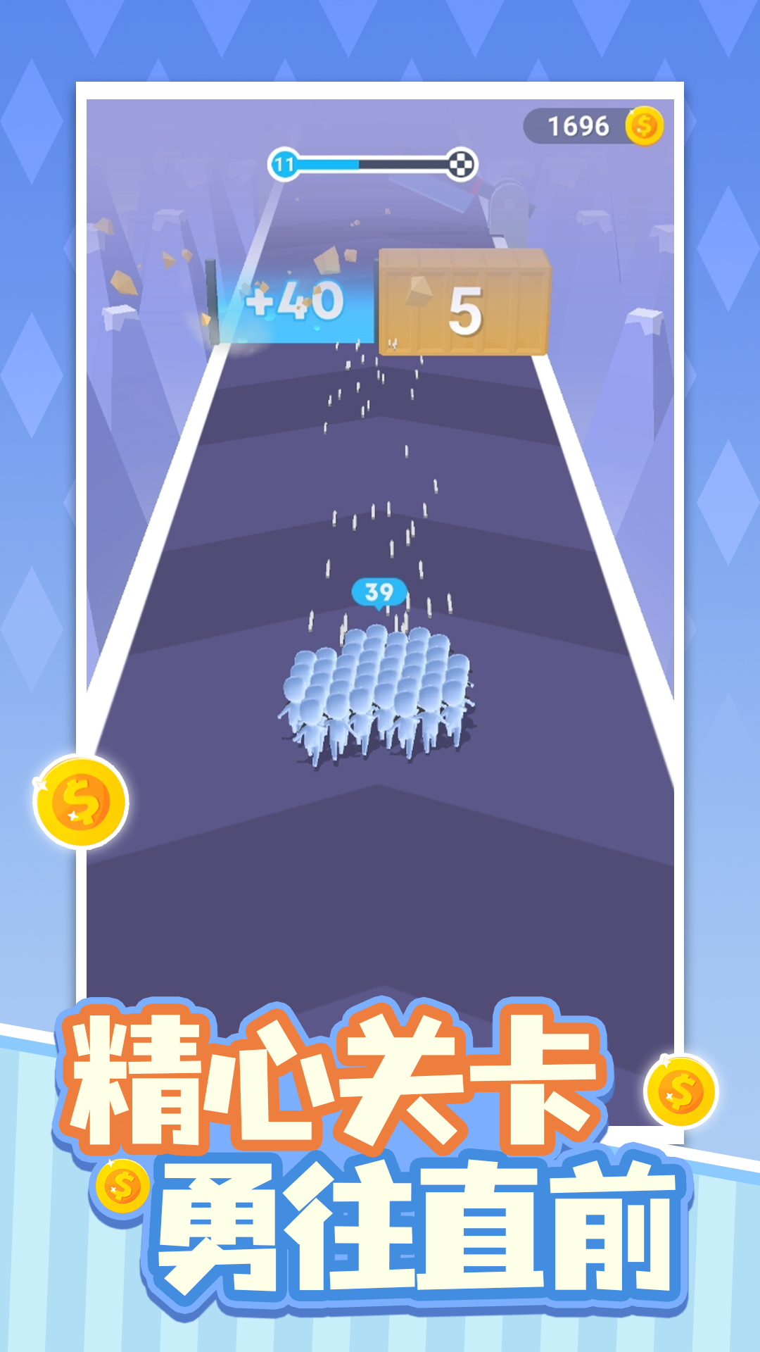 竞速勇敢冲是一款集结小人,一起冲刺跑酷的闯关游戏,玩家操控角色在赛道中奔跑时,可通过触碰或特定道具集结其他小人加入队伍,形成规模效应,小人数量越多,团队冲刺时的视觉冲击力越强,且部分关卡需达到人数门槛才能解锁后续路径,部分小人需触发机关、搭建桥梁,其余小人则负责冲刺,考验玩家的策略规划能力,一起冲刺到终点。